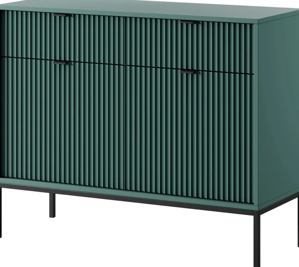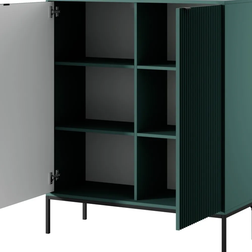 Odcień zieleni labrador doskonale komponuje się z metalowymi elementami, tworząc estetyczne i przytulne wnętrze. Wykończenie mebli jest odporne na zarysowania i łatwe w utrzymaniu czystości, co jest szczególnie ważne w codziennym użytkowaniu.