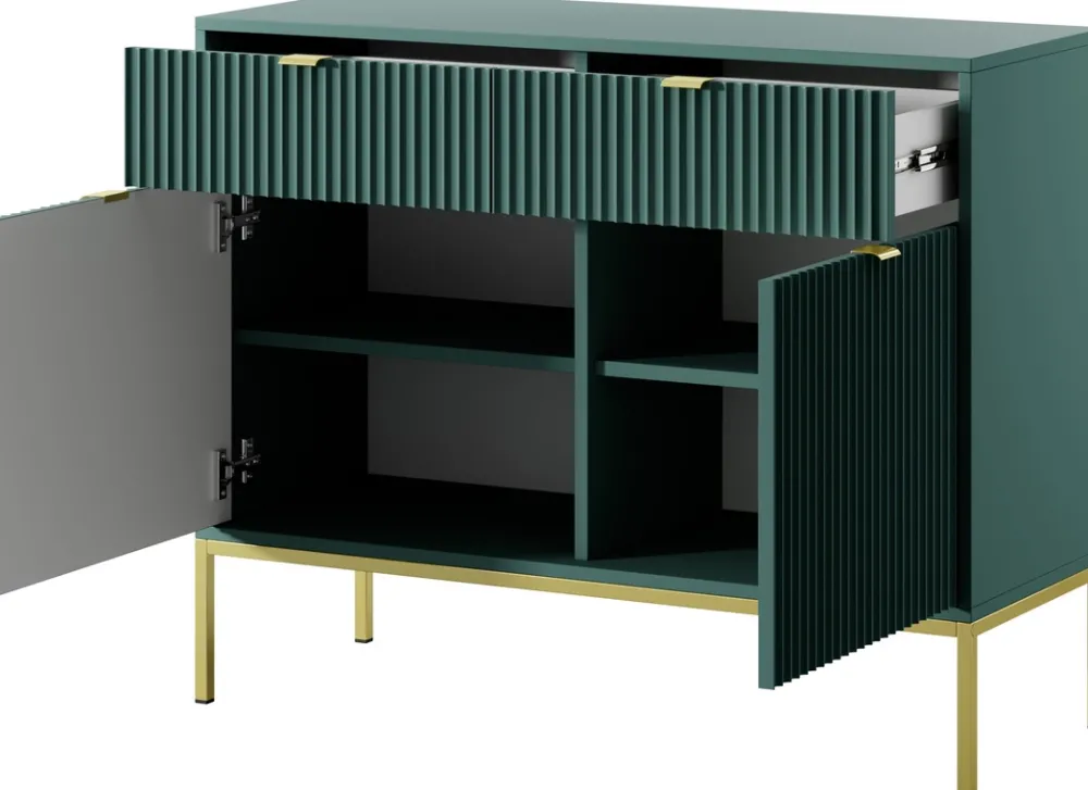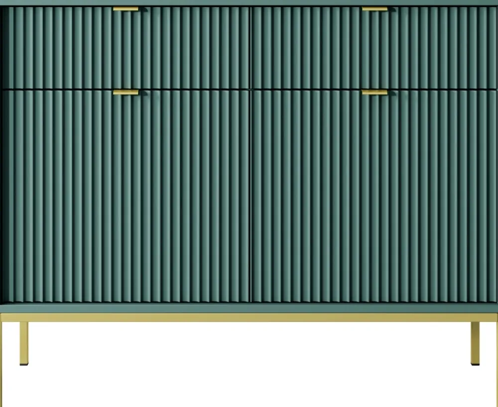 - Zestaw mebli do salonu AVANTI składa się z dwóch pojemnych komód, szafki RTV pod telewizor oraz stolika kawowego z szufladą. Meble posiadają złote metalowe nóżki, oraz złote aluminiowe uchwyty. Frezowane fronty dopełniają wyjątkową stylistykę mebli.