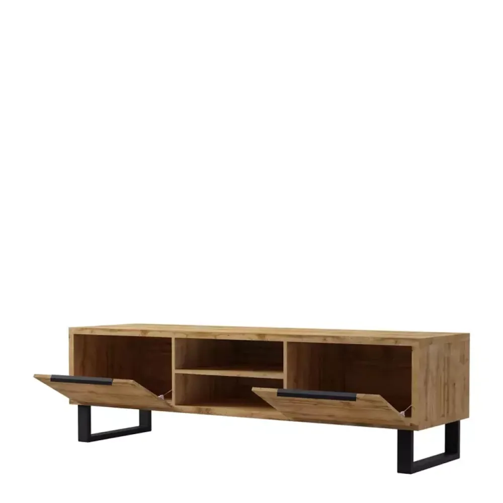 Szafka rtv loft wyposażona w uchylne w dół drzwiczki oraz półki.