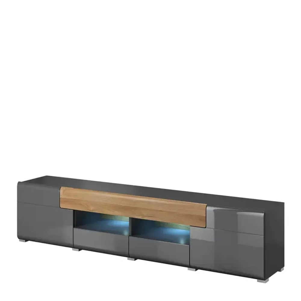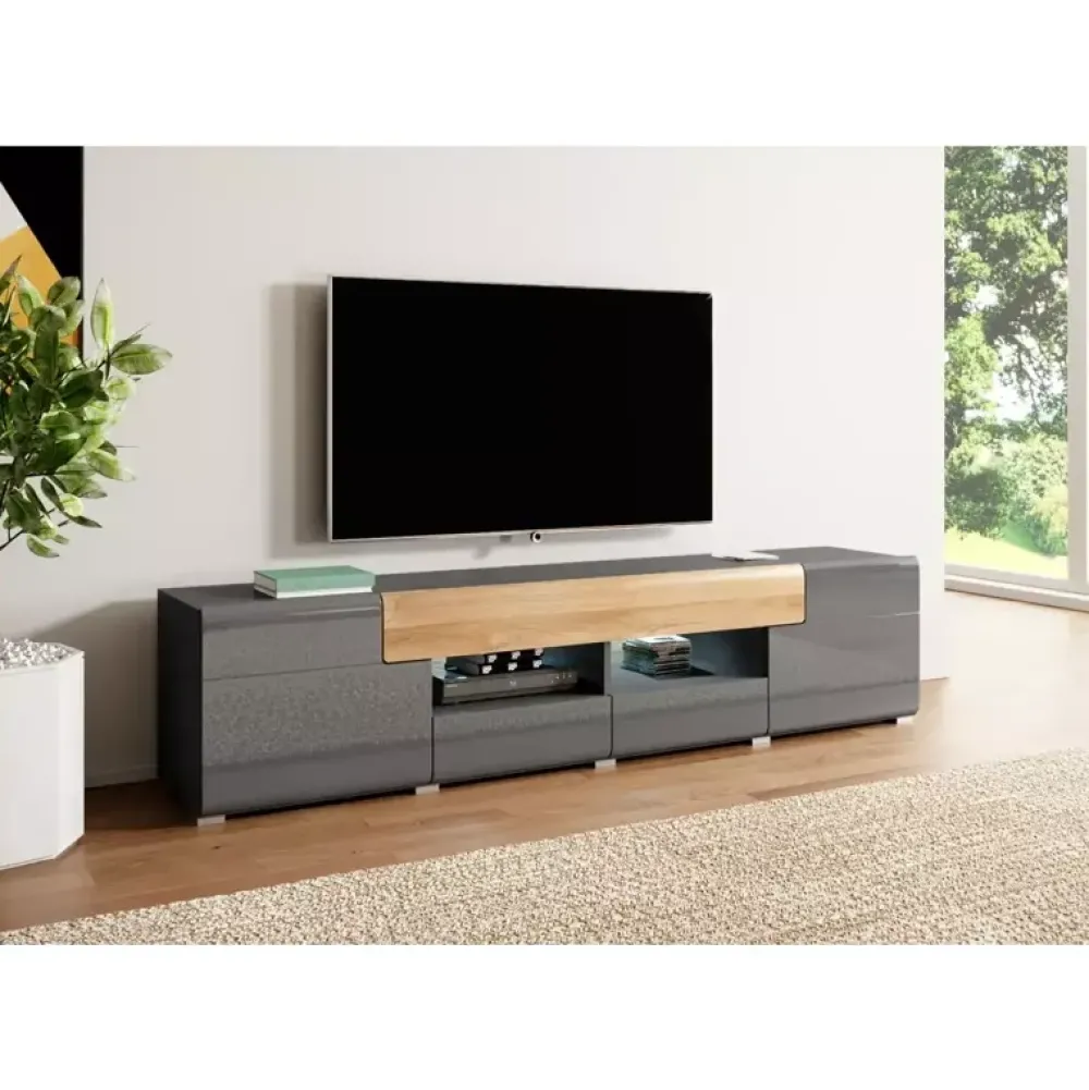 - Szafka rtv o szerokości 208 cm z drzwiczkami uchylnymi oraz szufladami.