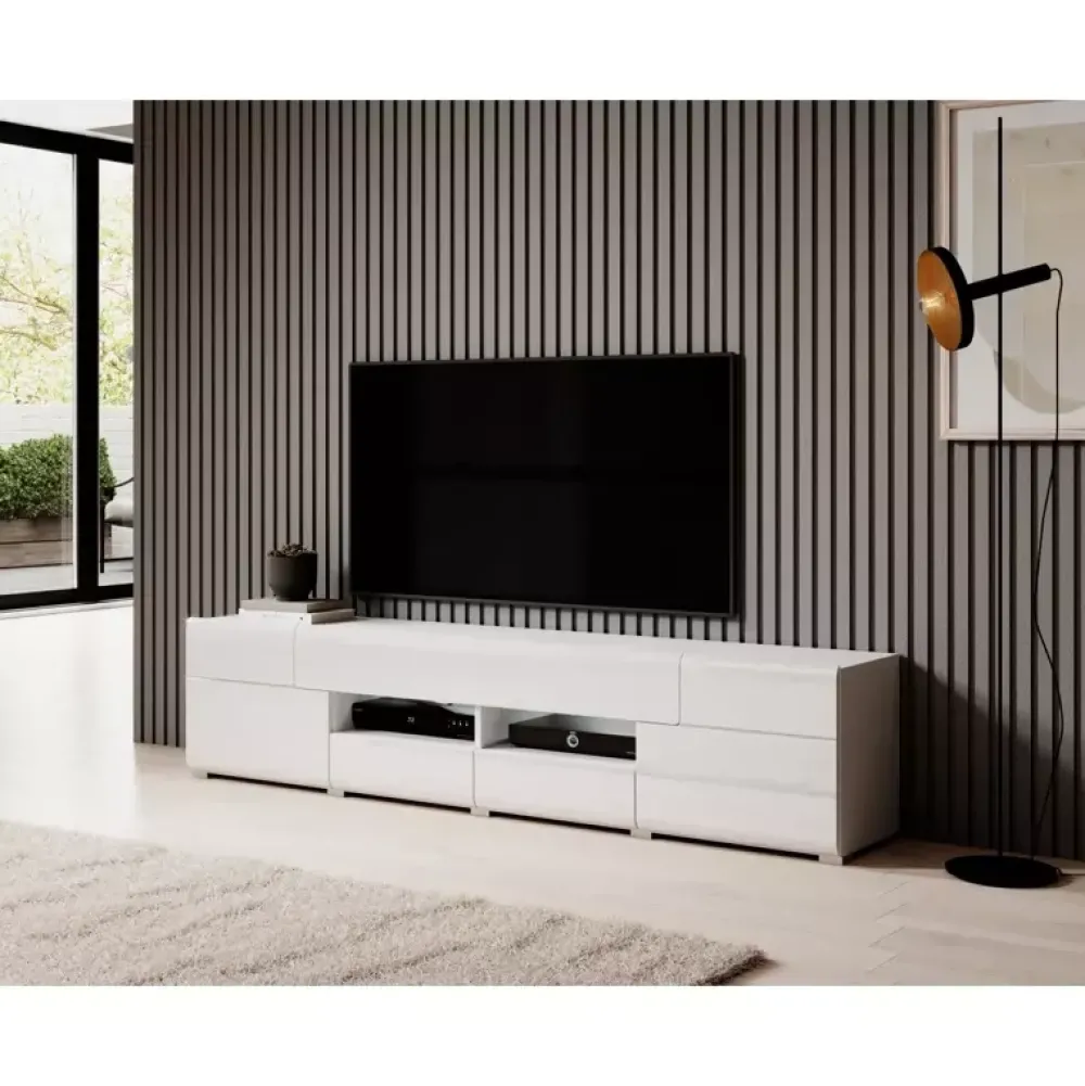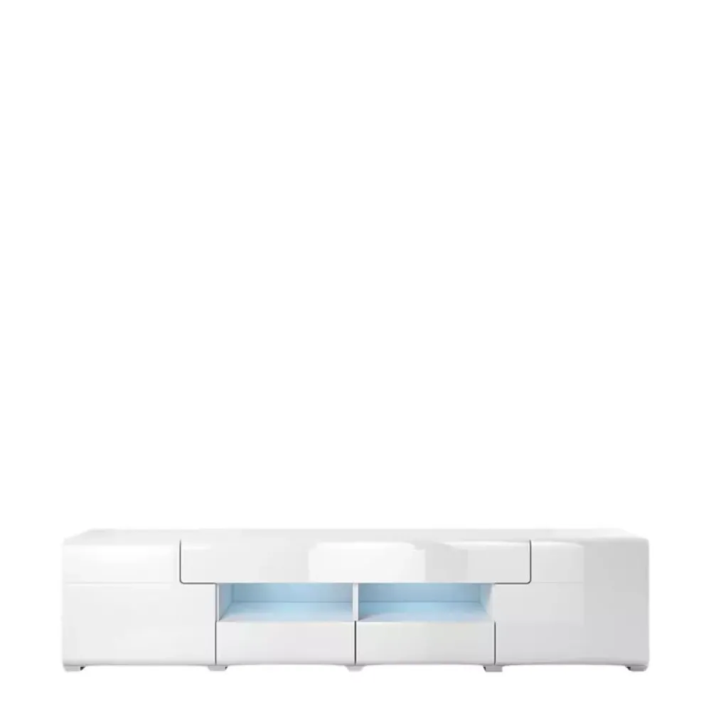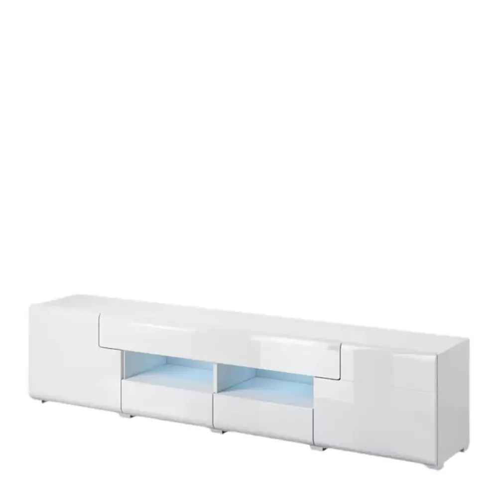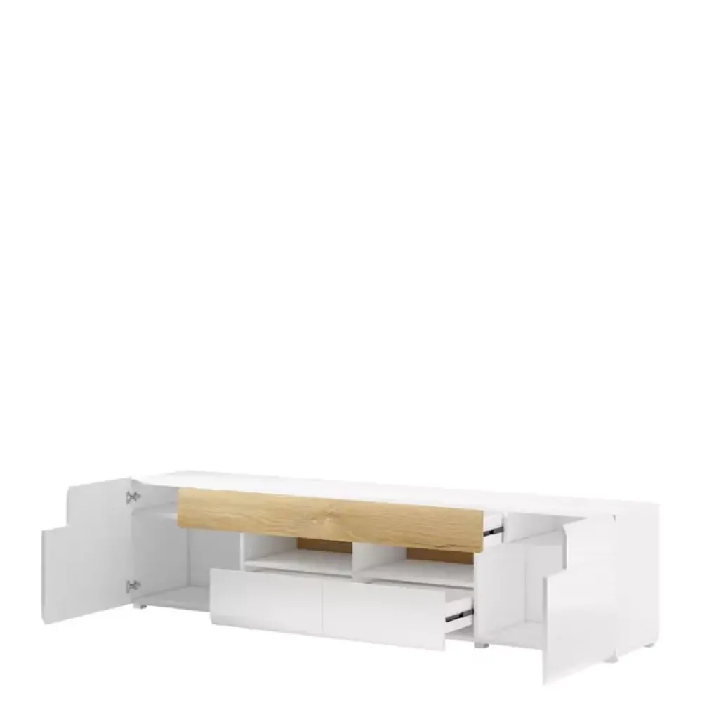 - Szafka rtv o szerokości 208 cm z drzwiczkami uchylnymi oraz szufladami.