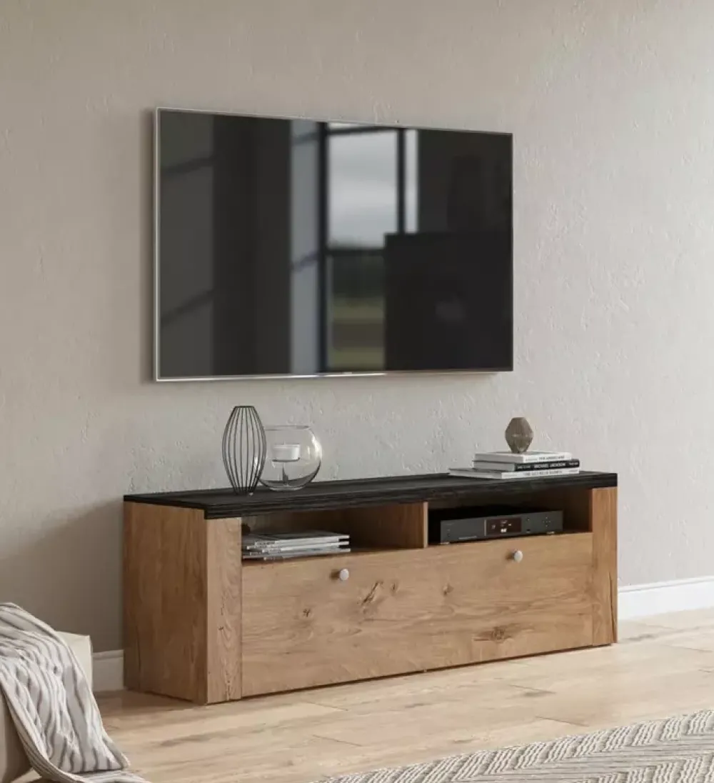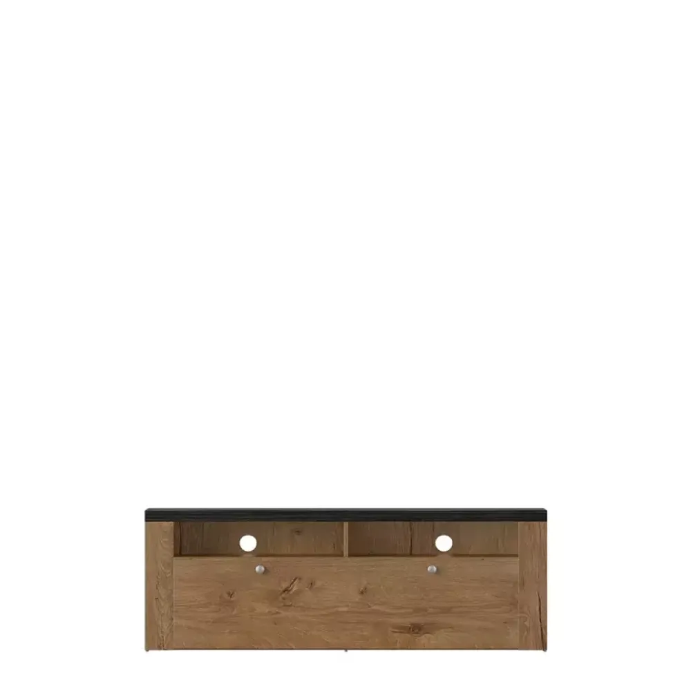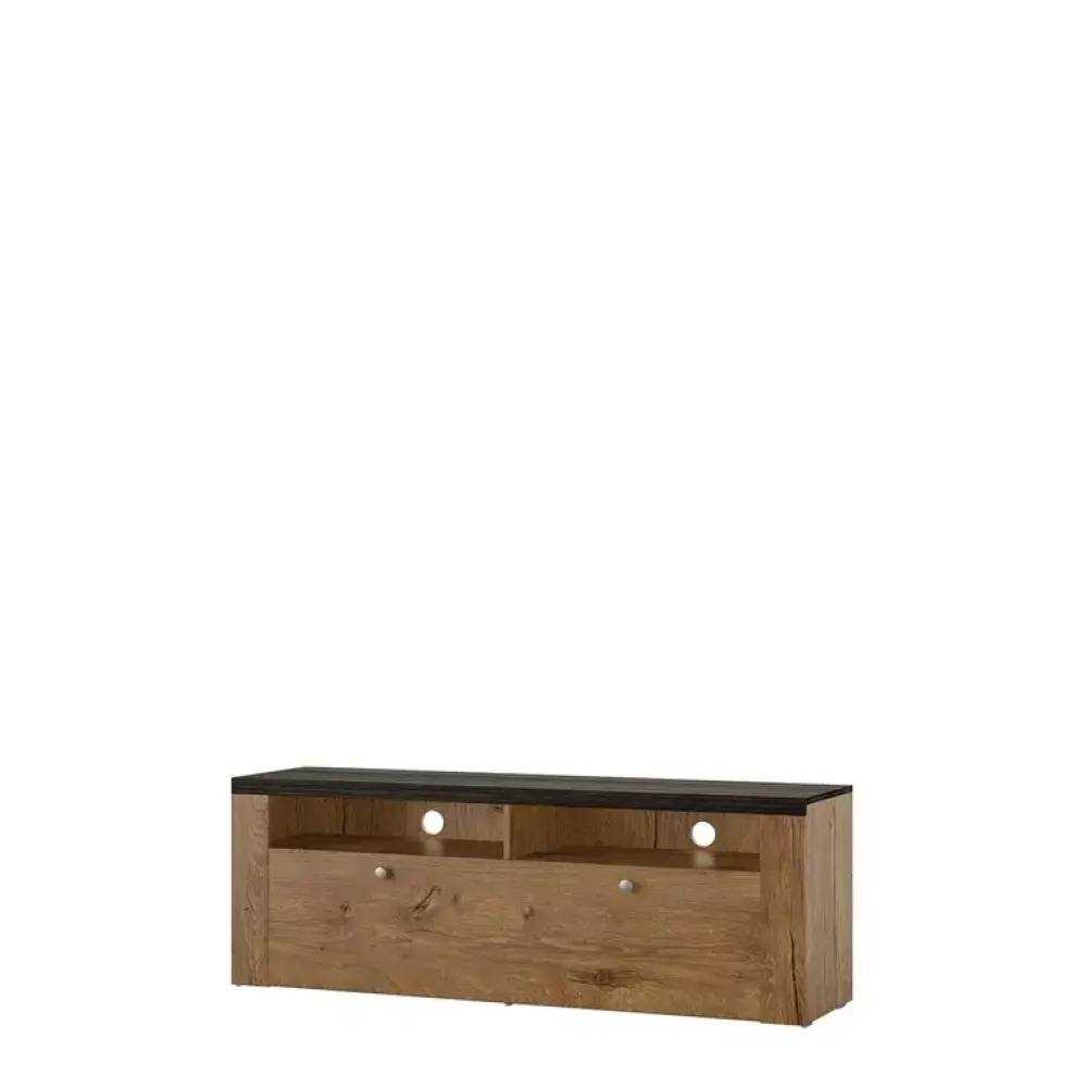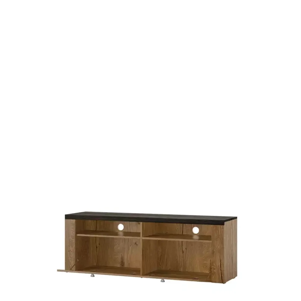 Szafka rtv do salonu o szerokości 140 cm wyposażona w uchylne w dół drzwiczki, za którymi znajduję się półka oraz otwarte półki.