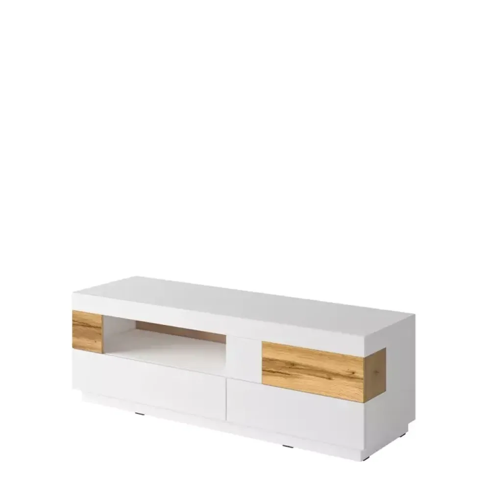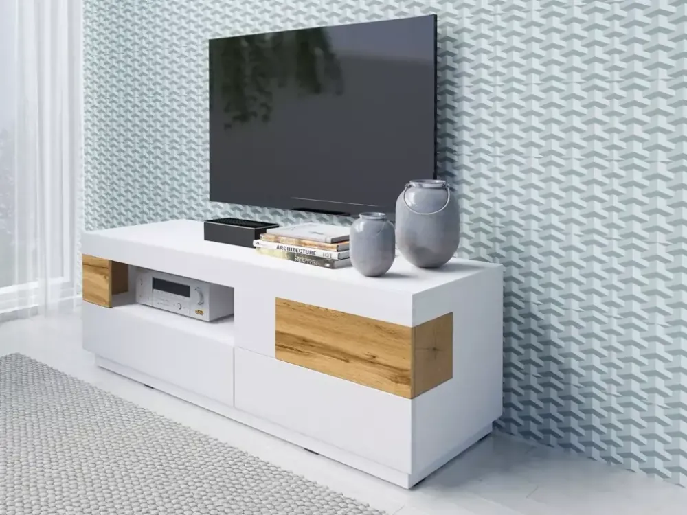 Szafka rtv o szerokości 160 cm ze wstawkami w rustykalnym stylu, wyposażona w dwie szuflady, półkę oraz uchylne w dół drzwiczki, za którymi znajduje się półka.