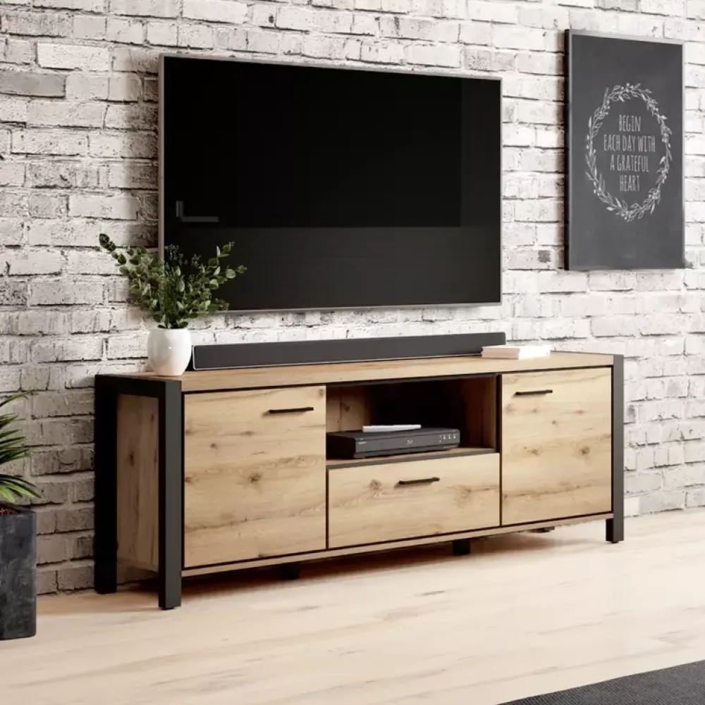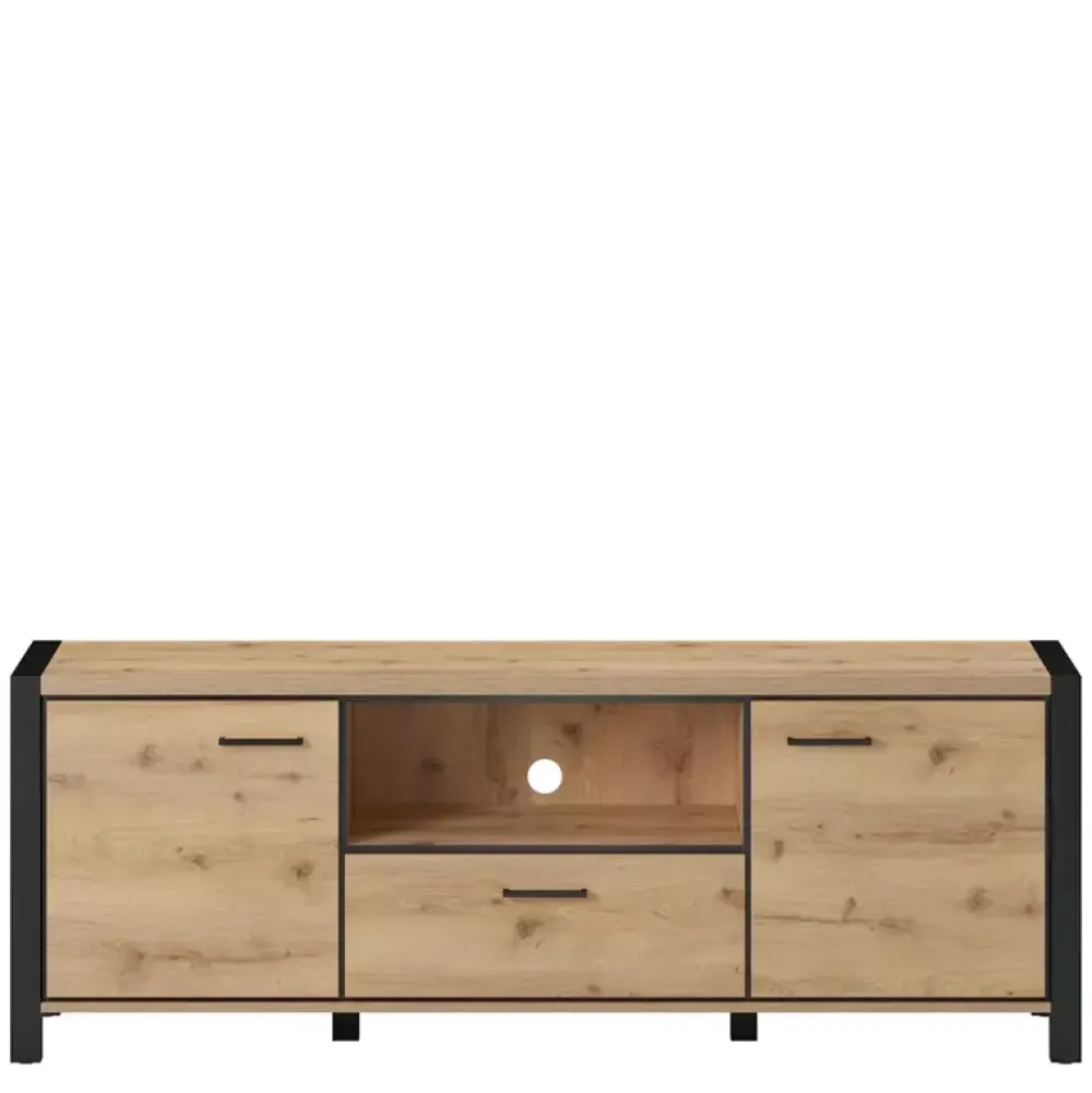 Szafka RTV ANGELINO posiada 180 cm szerokości oraz została wyposażona w drzwi po lewej i prawej stronie, za każdymi z nich znajdują się dwa poziomy pozwalające przechować przedmioty, które chcemy ukryć przed światłem dziennym. Natomiast w centralnej części szafki swoje miejsce odnalazła szuflada osadzona na prowadnicach kulkowych z pełnym wysuwem oraz wnęka z otworem na kable, dzięki któremu doskonale sprawdzi się do umieszczenia dekodera.