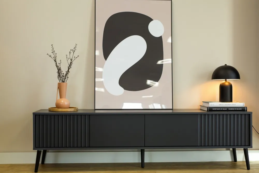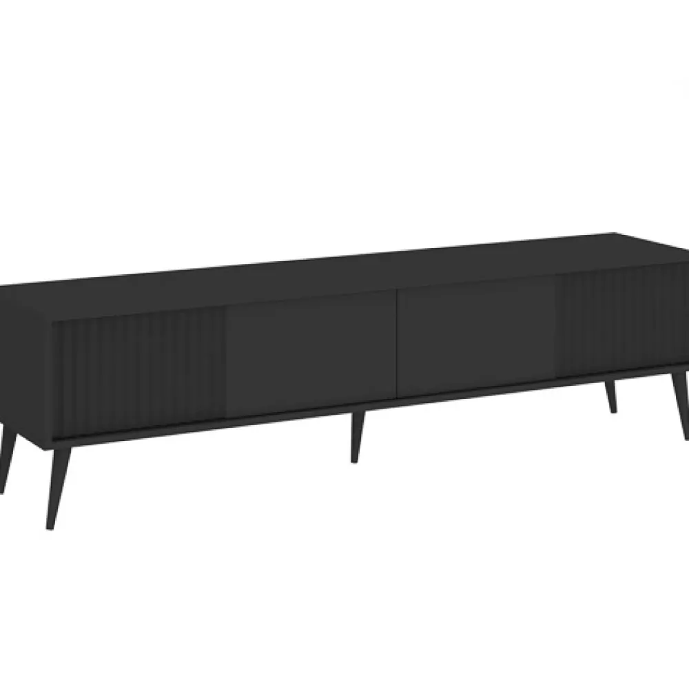 Szafka RTV BELLUNO o szerokości 180 cm to stylowe i funkcjonalne rozwiązanie dla miłośników nowoczesnych wnętrz. Matowe wykończenie w głębokim odcieniu antracytu oraz ryflowane fronty z płyty MDF przyciągają wzrok i nadają aranżacji niepowtarzalnego charakteru. Dwie uchylne klapy otwierane systemem „push to open” gwarantują wygodny dostęp do przestronnych wnętrz szafki – bez potrzeby stosowania uchwytów.