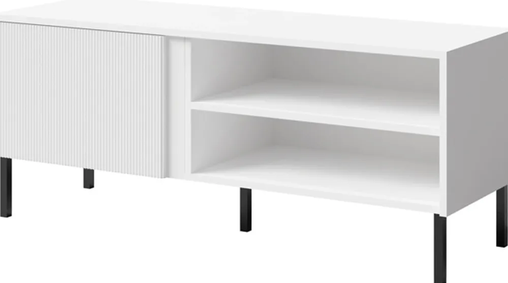 - Nowoczesna biała szafka RTV MALEZJA o szerokości 120 cm oparta została na wysokich metalowych nóżkach. Szafka RTV z lamelami oferuje sporo miejsca do przechowywania dzięki dwóm otwartym półkom oraz półce ukrytej za drzwiami z lamelami.