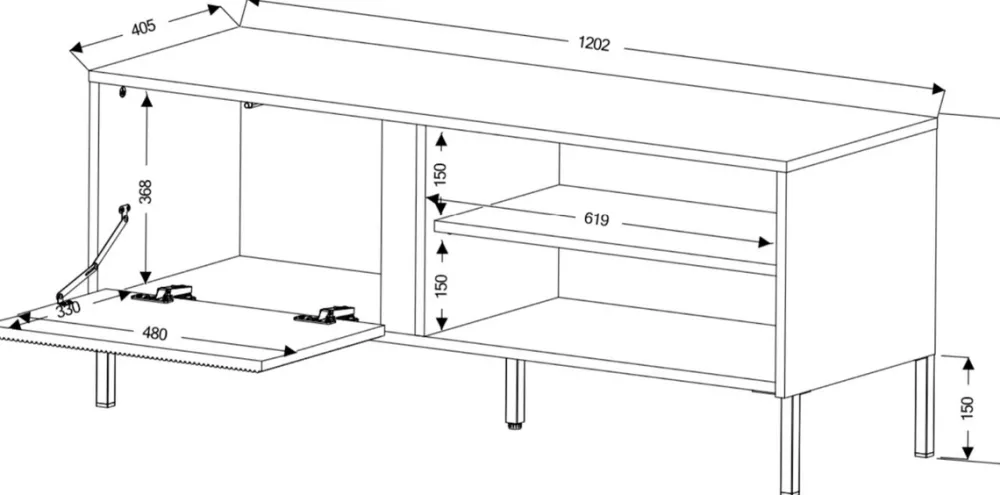 - Szafka RTV otwiera się za pomocą mechanizmu push to open, więc wystarczy jedno dotknięcie, żeby dostać się do przechowywanych w niej rzeczy.