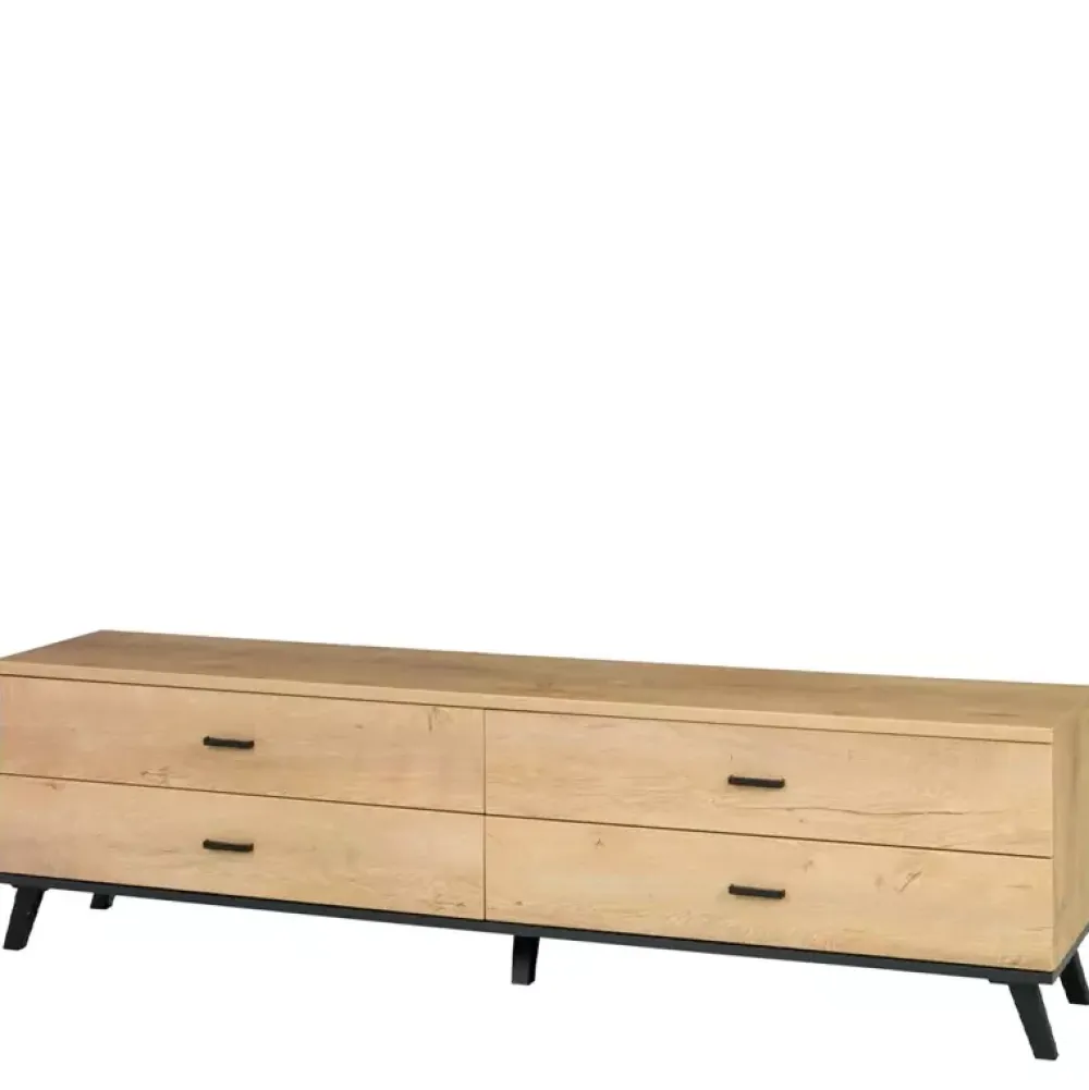 - Nowoczesna szafka pod telewizor na wysokich stopkach, wyposażona w cztery pojemne szuflady.