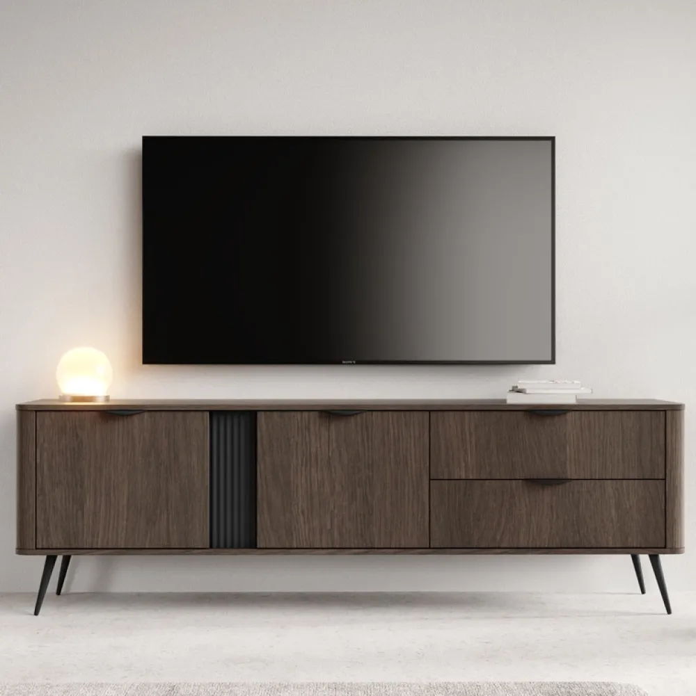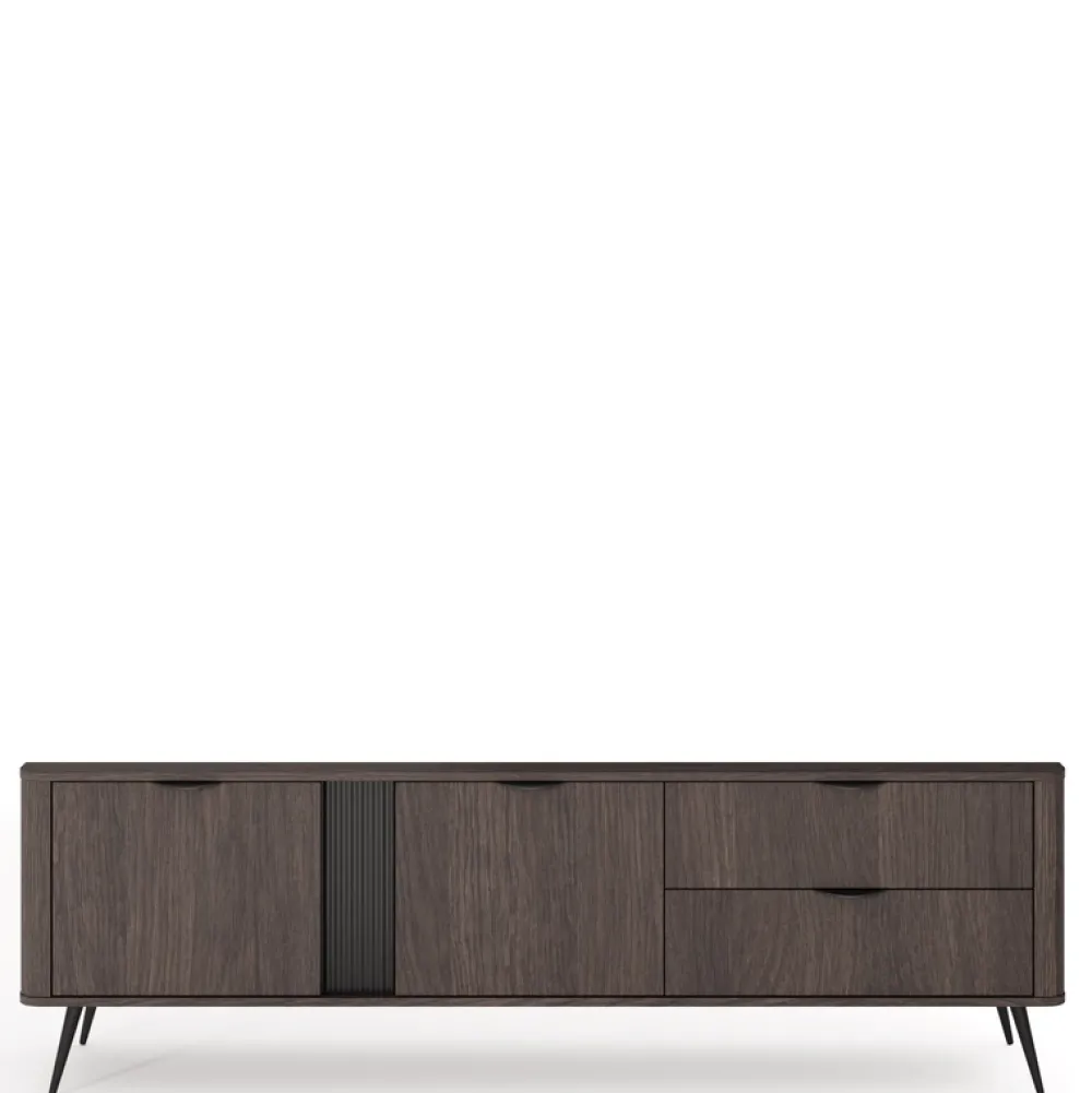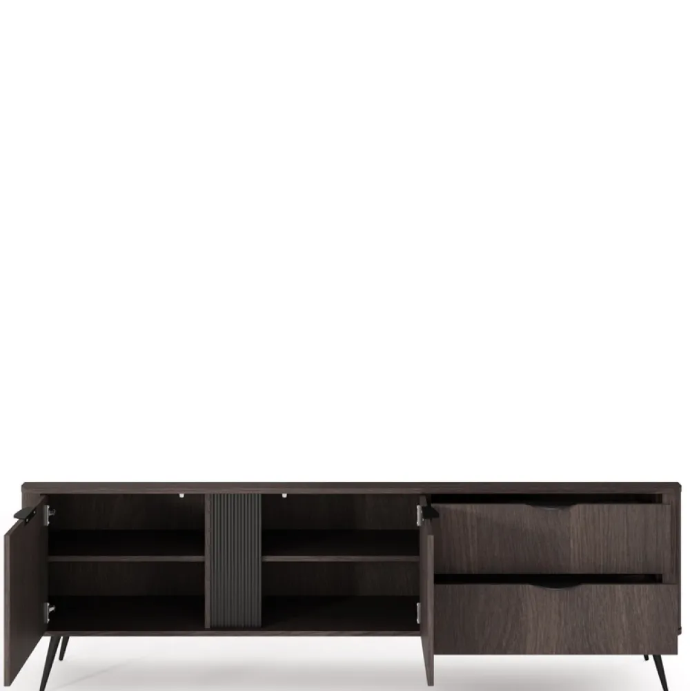 Szafka RTV dąb dunin VALIO to idealna propozycja dla miłośników nowoczesnych wnętrz z nutą elegancji. Ciemne wybarwienie dębu, ryflowana wstawka z MDF i czarne metalowe akcenty tworzą zgraną całość, która doskonale odnajdzie się w strefie wypoczynkowej. Przemyślany układ półek, szafek i szuflad pozwala przechować wszystko to, czego potrzebujesz w zasięgu ręki – od pilotów po kolekcję filmów.