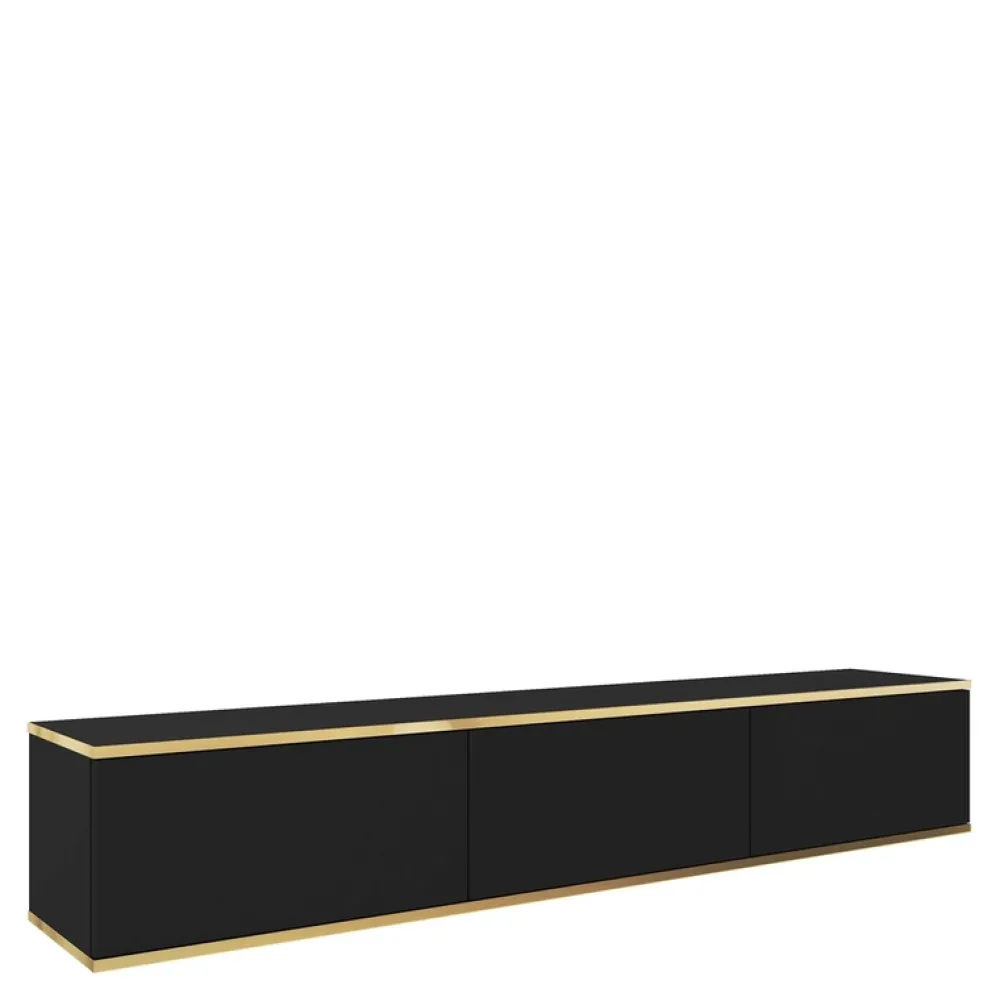 - Nowoczesna szafka RTV do salonu ORVIETO w kolorze czarnym ze złotą okleiną. Ma 175 cm szerokości. Posiada wygodny bezuchwytowy system otwierania push to open. Krawędzie są zakończone okleiną ABS.