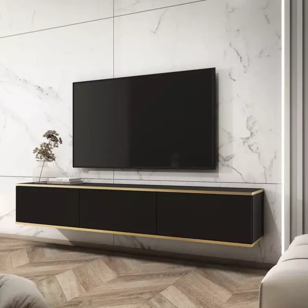 Ta nowoczesna szafka RTV ORVIETO z elegancką złotą okleiną sprawi, że Twój salon będzie przykuwał uwagę. Została wykonana z wysokiej jakości płyty laminowanej. Szeroki blat spokojnie pomieści duży telewizor oraz inne ozdoby, które dekorują Twoje wnętrze. Szafka ma zastosowanie uniwersalne, ponieważ można ją albo powiesić na ścianie lub postawić na podłodze, co daje możliwość wielu aranżacji wnętrza. Mechanizm otwierania jest na zawiasach puszkowych z systemem otwierania push to open. Krawędzie są zabezpieczone okleiną ABS odporną na uszkodzenia.