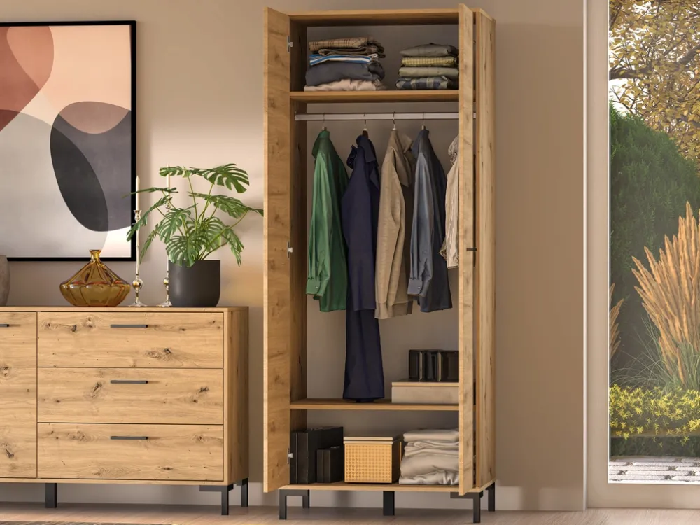 Ta dwudrzwiowa szafa to synonim praktyczności i stylu. Niezależnie od tego, czy potrzebujesz dodatkowego miejsca na ubrania w sypialni, czy szukasz eleganckiego mebla do przedpokoju, nasza szafa spełni Twoje oczekiwania, oferując przestronność i wytrzymałość w jednym.