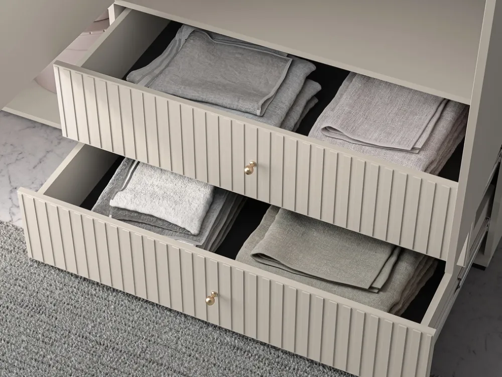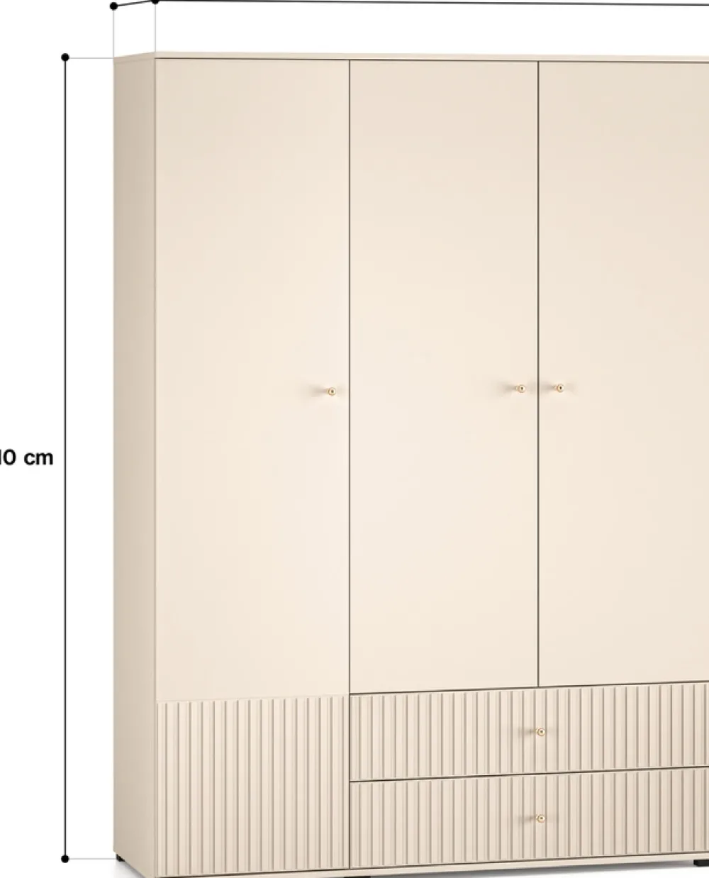 Dekoracyjne lamele na froncie i szufladach dodają meblowi charakteru, a złote uchwyty stanowią subtelny, luksusowy akcent. Szafa SOPHIE to połączenie stylu i praktyczności, które odnajdzie się zarówno w klasycznej sypialni, jak i nowoczesnym przedpokoju.