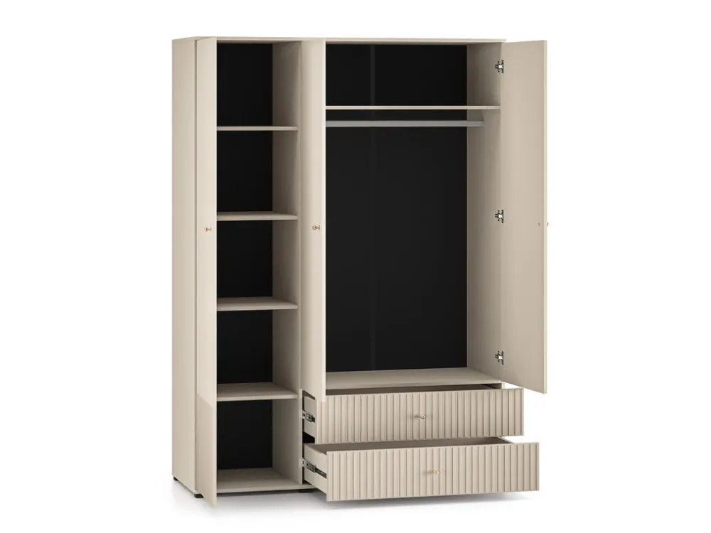 - Szafa SOPHIE 150 cm w kolorze kaszmir to eleganckie i funkcjonalne rozwiązanie do sypialni. Oferuje sześć półek, dwie szuflady, drążek na wieszaki, złote uchwyty, lamele MDF i czarne metalowe nóżki. Łączy styl, trwałość i wygodę codziennego użytkowania.
