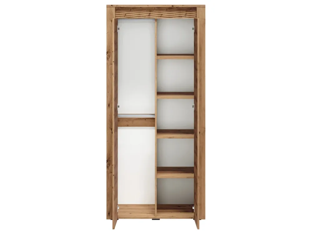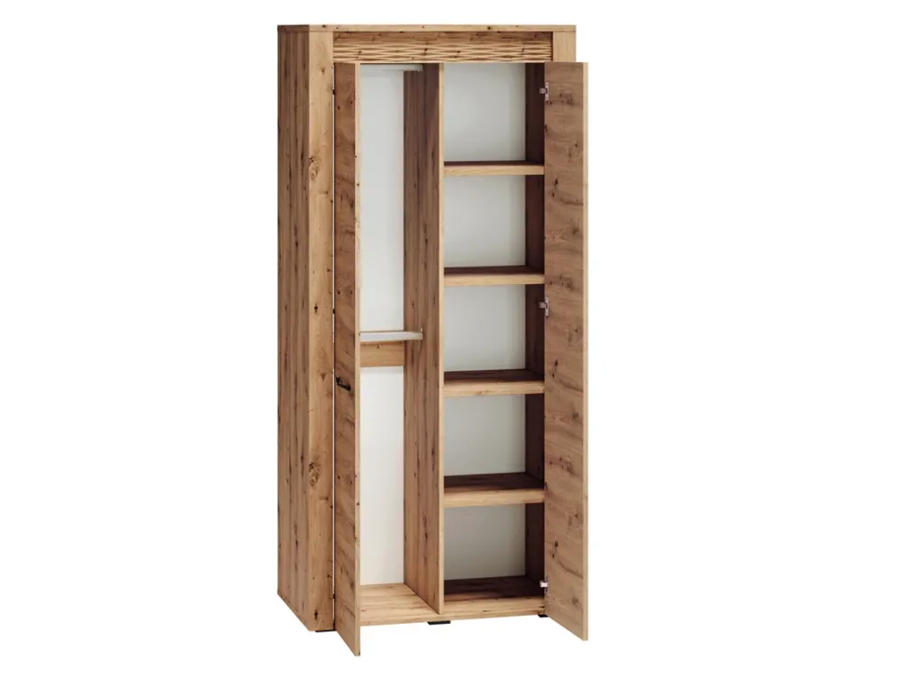 Szafa została zaprojektowana z myślą o maksymalnym wykorzystaniu przestrzeni. Drzwi po lewej stronie kryją dwa aluminiowe drążki, które są idealne do przechowywania odzieży wiszącej – od eleganckich garniturów po codzienne stroje. Po prawej stronie znajdują się drzwi z pięcioma solidnymi półkami, które doskonale sprawdzą się do organizacji mniejszych przedmiotów, takich jak bielizna, dodatki czy ręczniki.