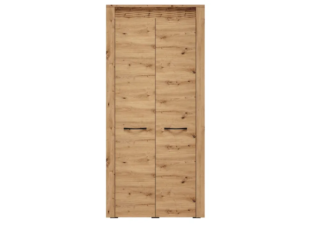 - Szafa do salonu ARTIS posiada parę drzwi, po lewej stronie znajdują się dwa aluminiowe drążki na wieszaki natomiast po prawej stronie pięć półek na ubrania. Szafa posiada ryflowany dekor u góry wykonany z płyty MDF. Czarne uchwyty wykonane z metalu.