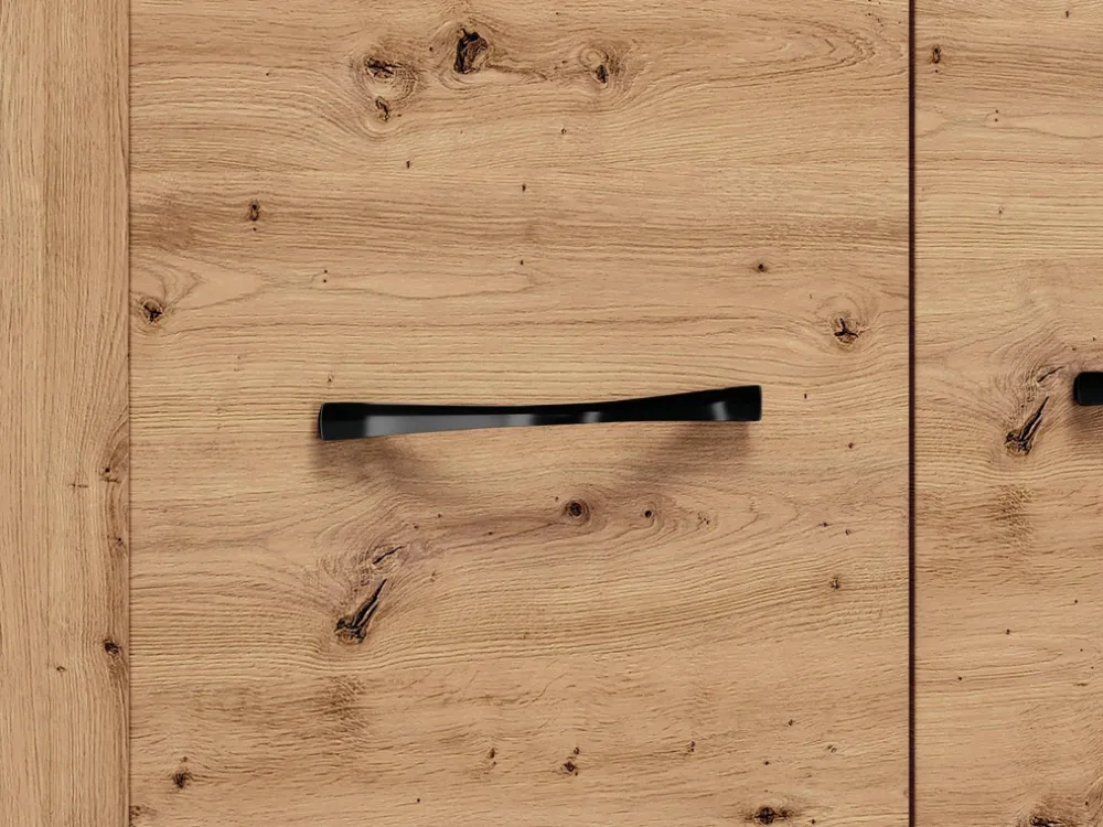 Szafa wyróżnia się nie tylko funkcjonalnością, ale także nowoczesnym designem. Czarne metalowe uchwyty nadają jej eleganckiego charakteru i podkreślają jej współczesny styl. Obrzeża wykończone trwałą okleiną ABS gwarantują, że mebel będzie odporny na codzienne użytkowanie, zachowując swój atrakcyjny wygląd przez lata.