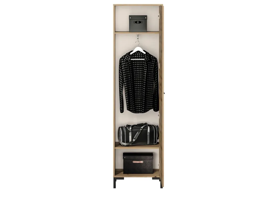 To praktyczne rozwiązanie do każdego przedpokoju. Szafa jest jednodrzwiowa, a możliwość montażu drzwi zarówno w wersji prawostronnej, jak i lewostronnej, pozwala na elastyczne dopasowanie mebla do indywidualnych potrzeb i układu pomieszczenia.