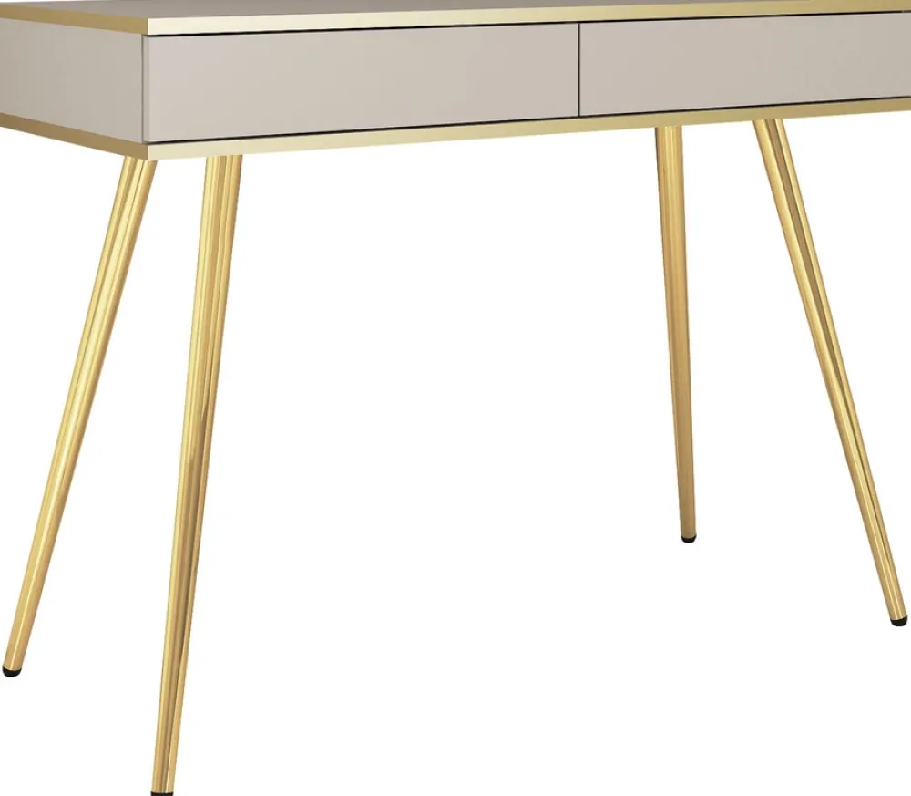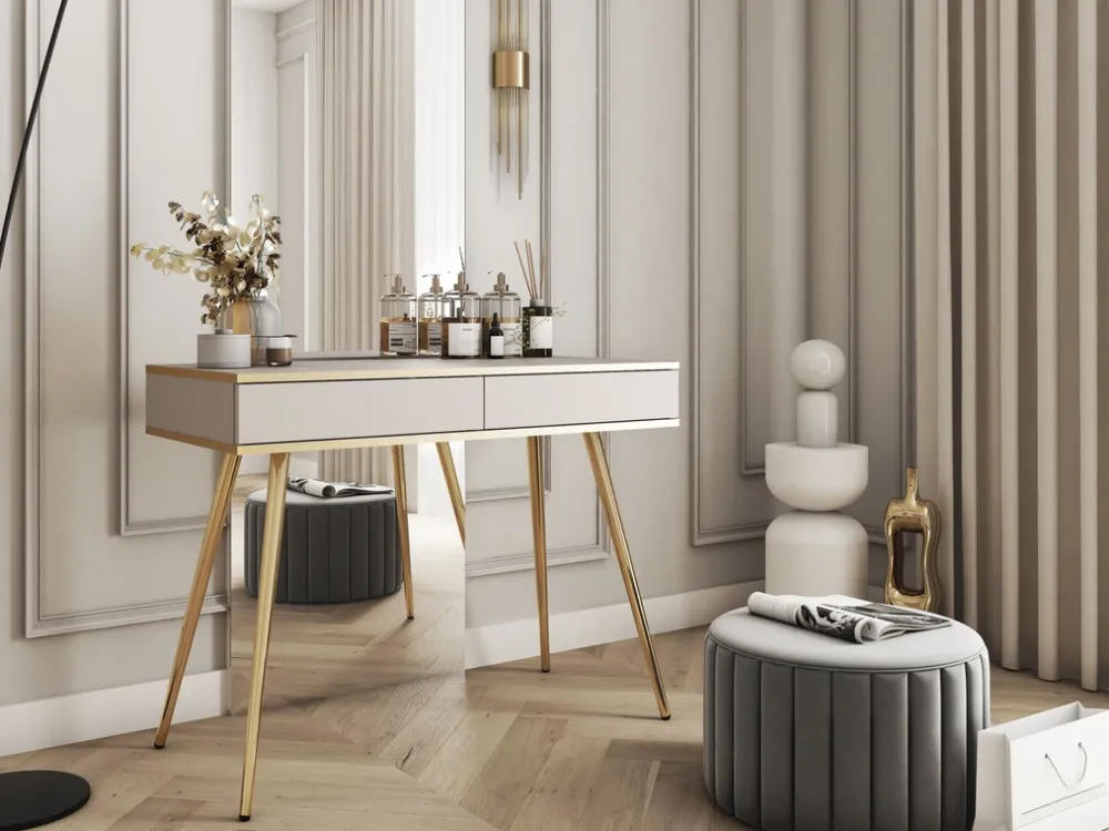 Nowoczesny charakter mebla podkreślają wysokie metalowe nóżki, które nadają lekkości całej konstrukcji, a jednocześnie zapewniają stabilność i trwałość. Dzięki nim toaletka wygląda subtelnie i elegancko, doskonale wpisując się w aktualne trendy wnętrzarskie.