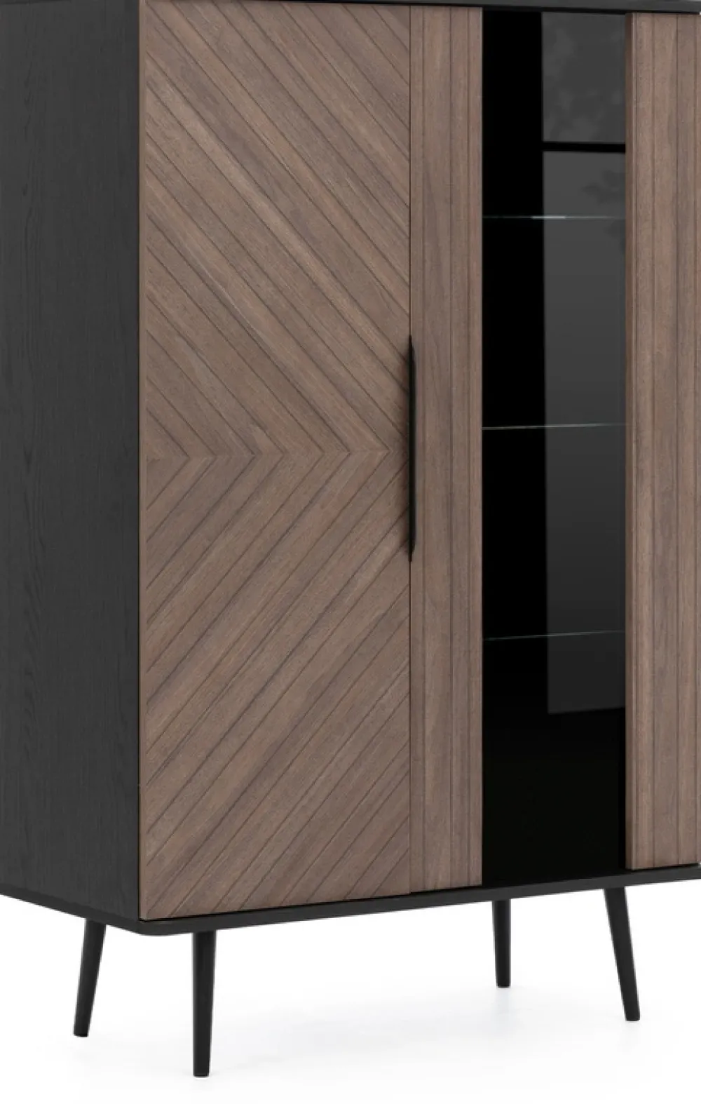 Czarne metalowe nóżki o wysokości 20 cm oraz czarne metalowe uchwyty podkreślają nowoczesny charakter mebla. Stabilna konstrukcja zapewnia bezpieczeństwo i długowieczność użytkowania. Wysokiej jakości okleina ABS na obrzeżach chroni witrynę przed uszkodzeniami mechanicznymi, zapewniając jej estetyczny wygląd przez wiele lat.