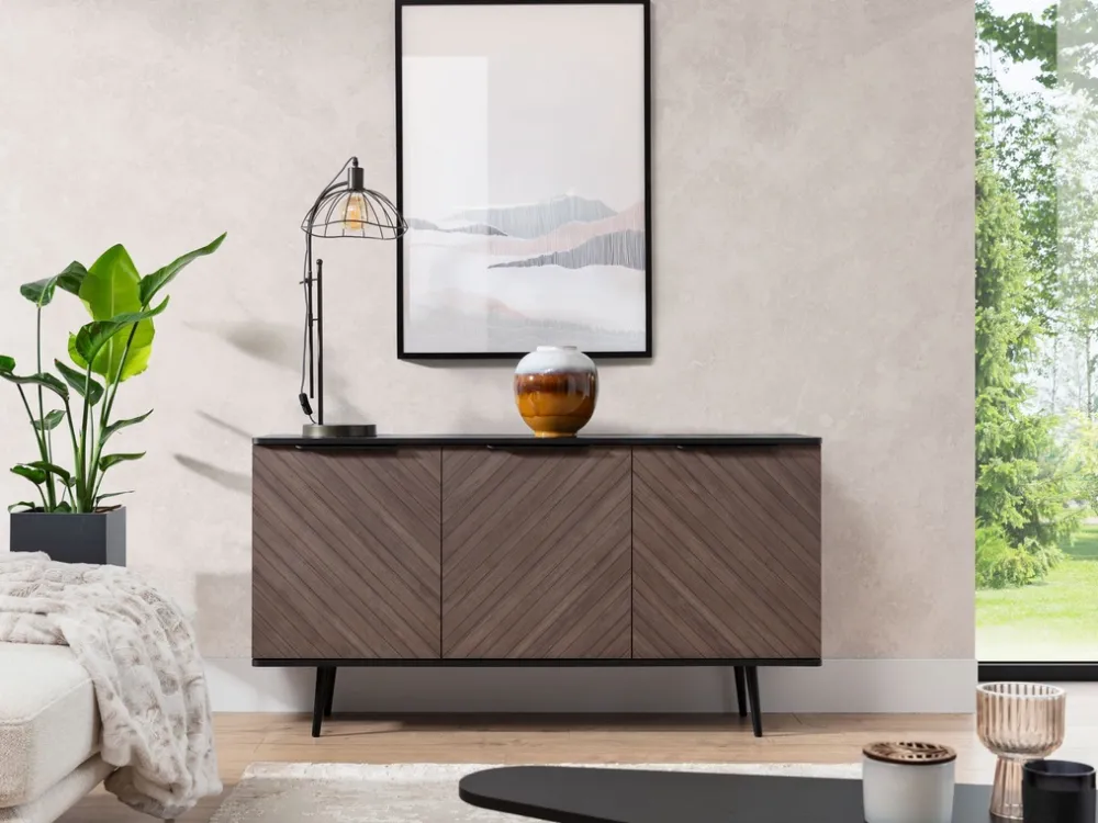 Po prawej stronie znajdziesz drzwi z przeszkleniem, za którymi znajdują się trzy szklane półki. To idealne miejsce na eksponowanie eleganckich dekoracji, rodzinnych pamiątek czy stylowej zastawy. Przeszklone drzwi nadają witrynie lekkości i pozwalają na wyeksponowanie Twoich ulubionych przedmiotów.