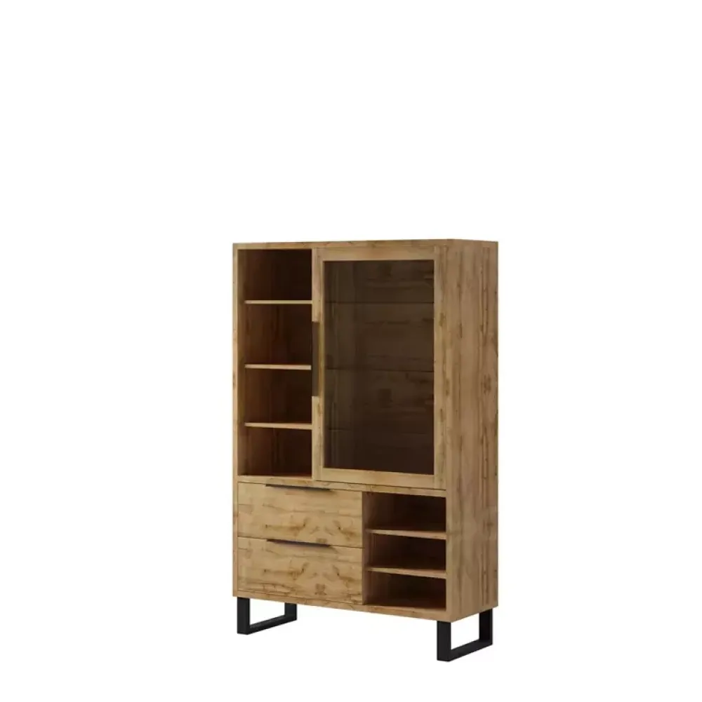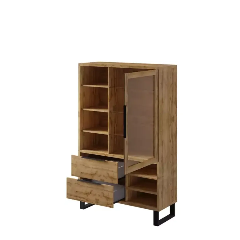 Nowoczesna witryna szklana do salonu o szerokości 120cm wyposażona w drzwiczki uchylne, otwarte półki oraz szuflady.