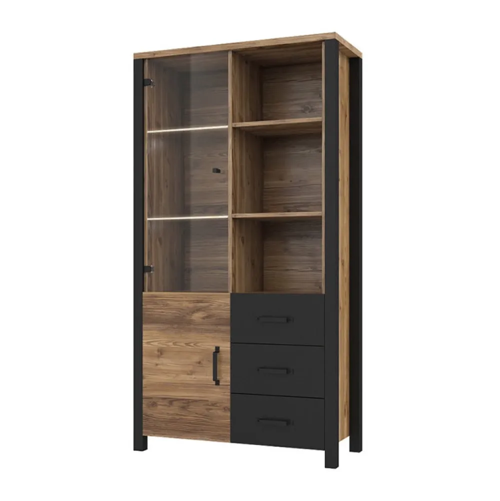 Nowoczesna witryna do salonu o szerokości 101 cm w stylu industrialnym, wyposażona w drzwiczki uchylne, szuflady oraz półki.