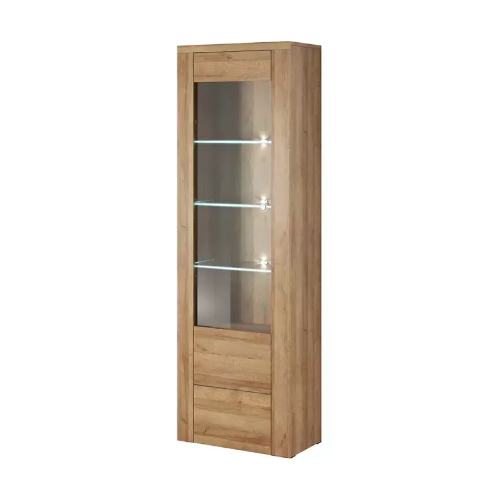 Elegancka witryna stojąca o szerokości 65 cm wyposażona w drzwiczki uchylne, za którymi znajdują się półki.