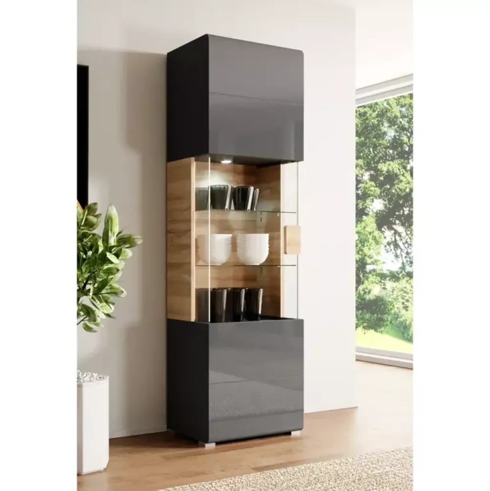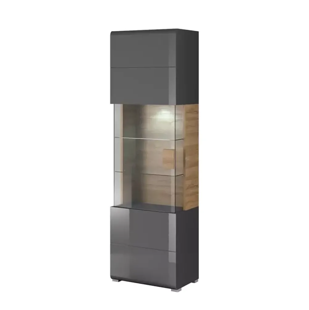 Elegancka witryna stojąca o szerokości 61 cm wyposażona w drzwiczki uchylne z szybą, za którymi znajdują się półki.