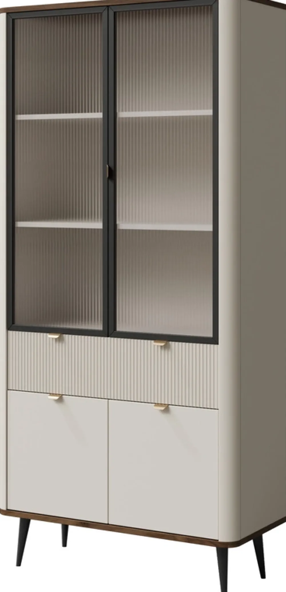 Dodaj elegancji swojemu salonowi dzięki funkcjonalnej witrynie, która łączy efektowną formę z dużą ilością miejsca do przechowywania. Przeszklone drzwi umożliwiają piękną prezentację dekoracji, książek lub porcelany, a ukryte półki i szuflada pomogą utrzymać porządek w codziennym użytkowaniu. To mebel, który zachwyca zarówno wyglądem, jak i wygodą.
