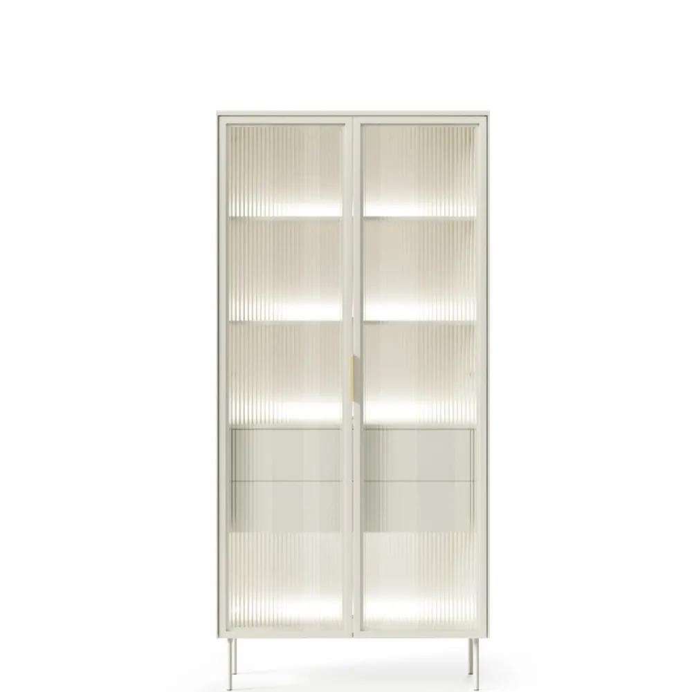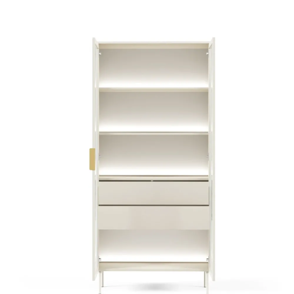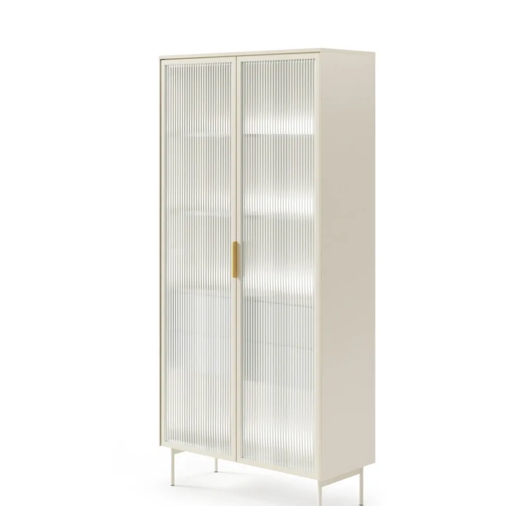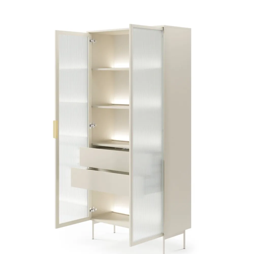 - Witryna z szufladami w kolorze kaszmir to elegancki mebel łączący ryflowane szkło flutes, wbudowane oświetlenie LED i szuflady z systemem push to open. Dzięki smukłej formie i złotym detalom doskonale sprawdzi się nawet w mniejszych, stylowych wnętrzach.