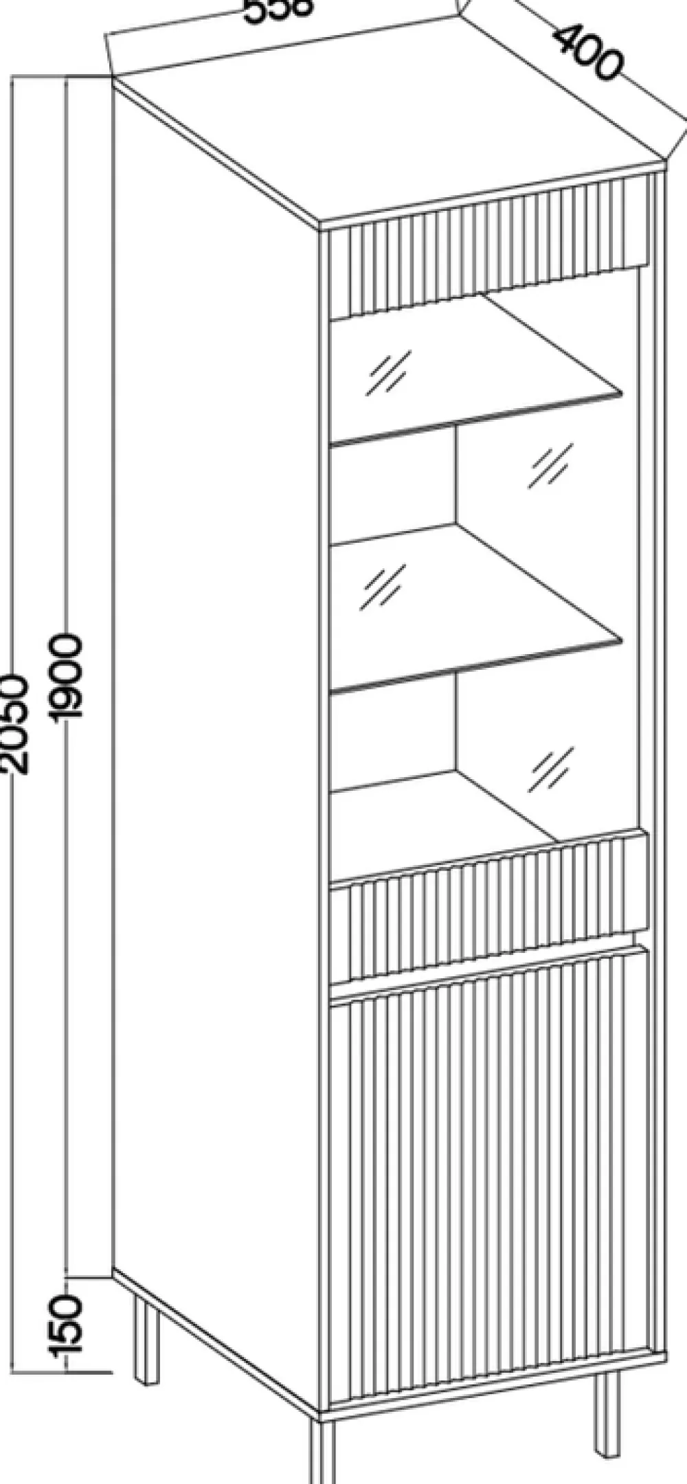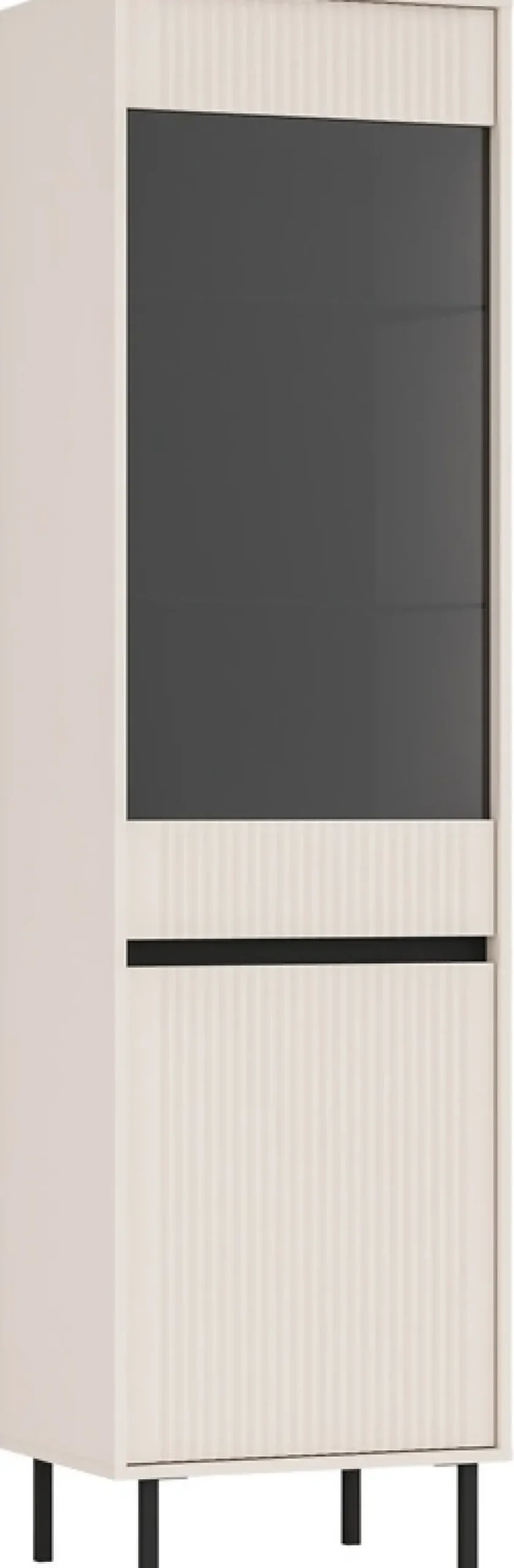 Minimalistyczna forma i neutralna kolorystyka sprawiają, że witryna doskonale wpisuje się w różnorodne style wnętrzarskie – od nowoczesnych i skandynawskich po klasyczne aranżacje. Jej kompaktowa szerokość 58 cm czyni ją idealnym wyborem nawet do mniejszych pomieszczeń.