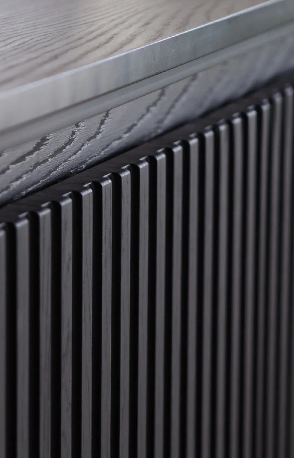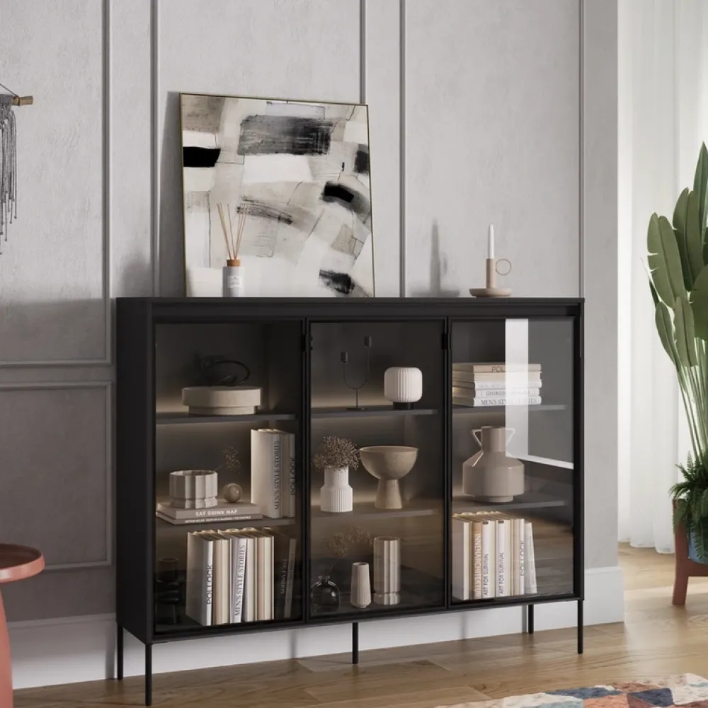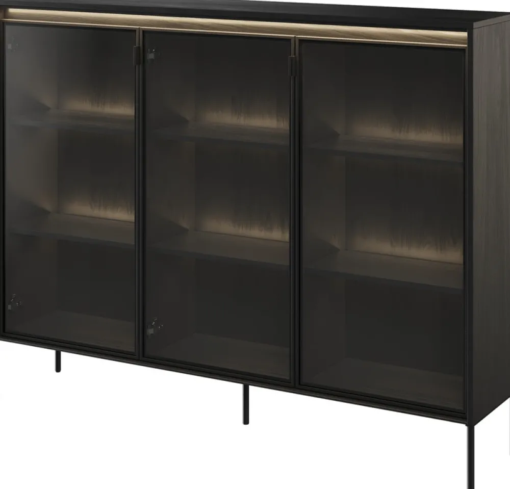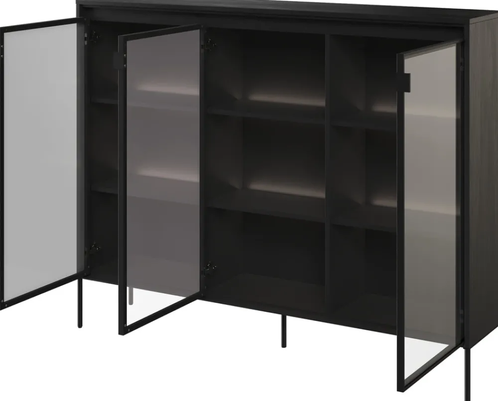 Witryna wyróżnia się niepowtarzalnym designem, ze szklanymi frontami barwionymi na kolor antisol grafitowy. Ten elegancki, głęboki odcień nie tylko podkreśla wyrafinowany charakter mebla, ale także gwarantuje jego trwałość i łatwość w czyszczeniu.