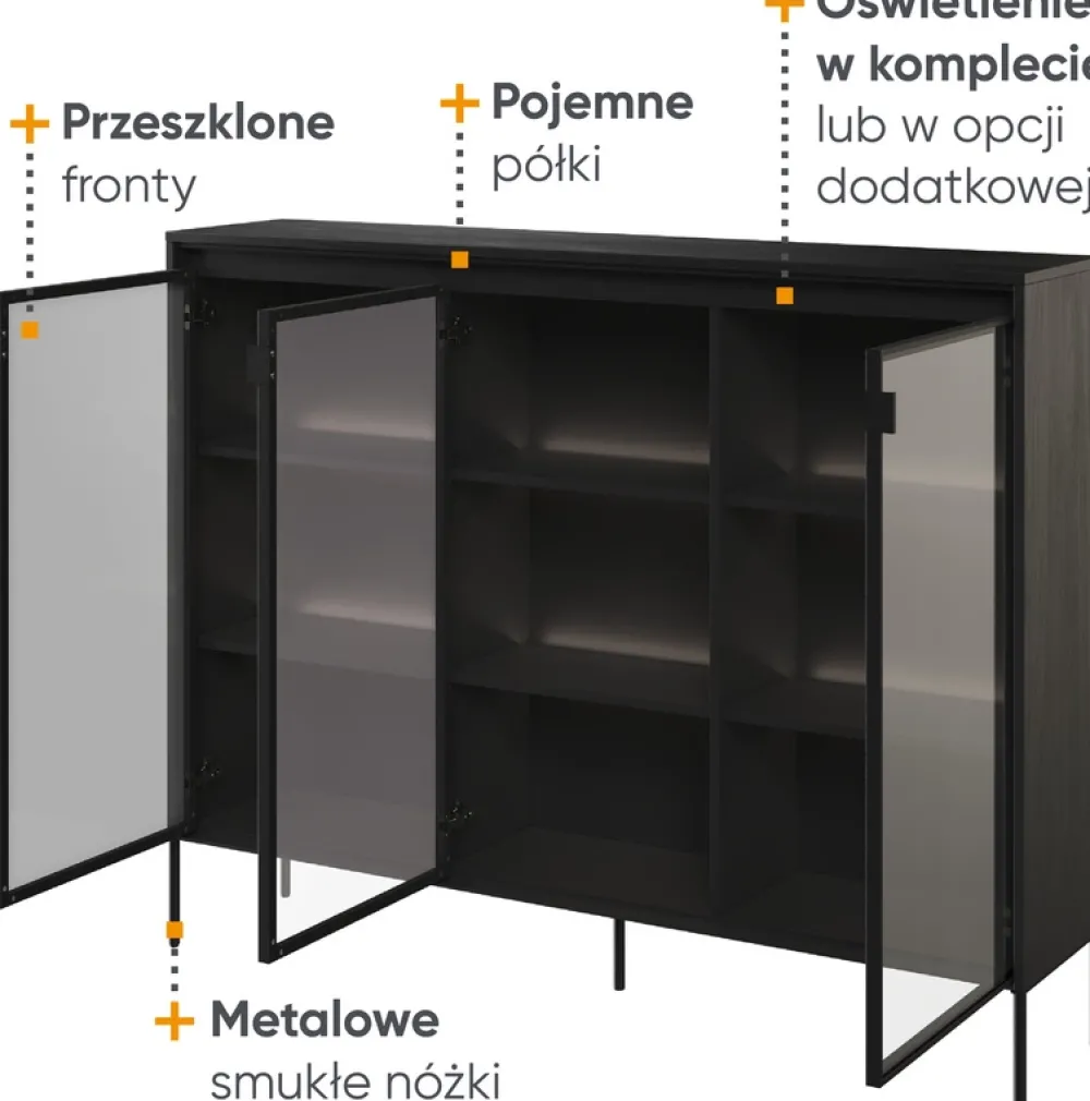 Komfort użytkowania zwiększy oświetlenie LED klasy energetycznej A++, które w subtelny sposób podkreśli prezentowane przedmioty i wprowadzi klimat do salonu oraz nie będzie generować dużych kosztów energii elektrycznej. Oświetlenie półek opcjonalnie można dokupić w sekcji polecane.