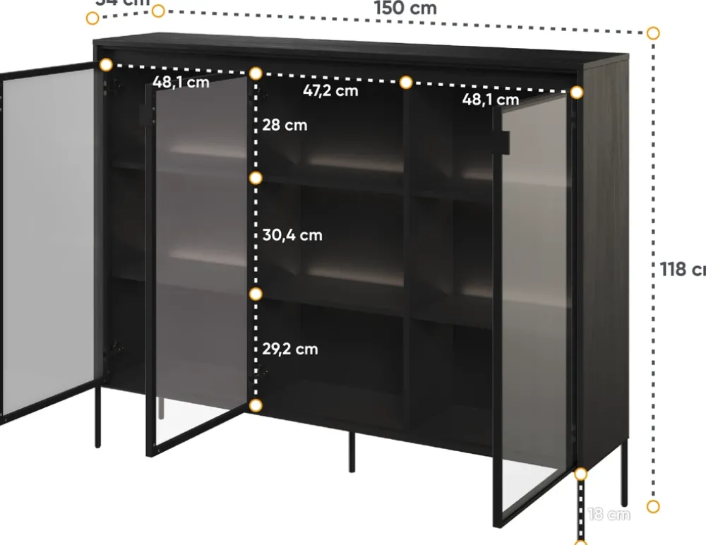 Witryna stoi na wysokich, smukłych metalowych nogach, które dodają jej lekkości i modernistycznego wyrazu, jednocześnie zapewniając stabilność. Korpus witryny, razem ze ścianą tylną, wykonane są z wytrzymałej płyty laminowanej o grubości 16 mm, która jest nie tylko trwała, ale również odporna na zarysowania i łatwa w utrzymaniu czystości.
