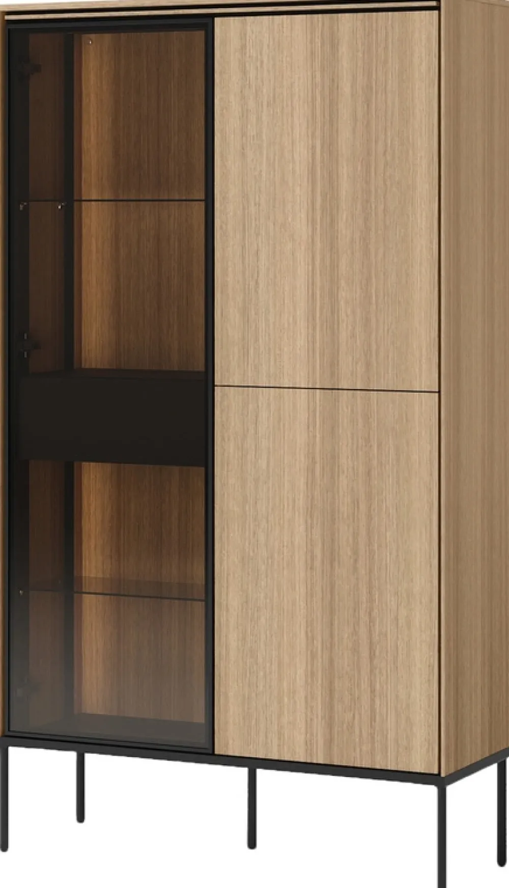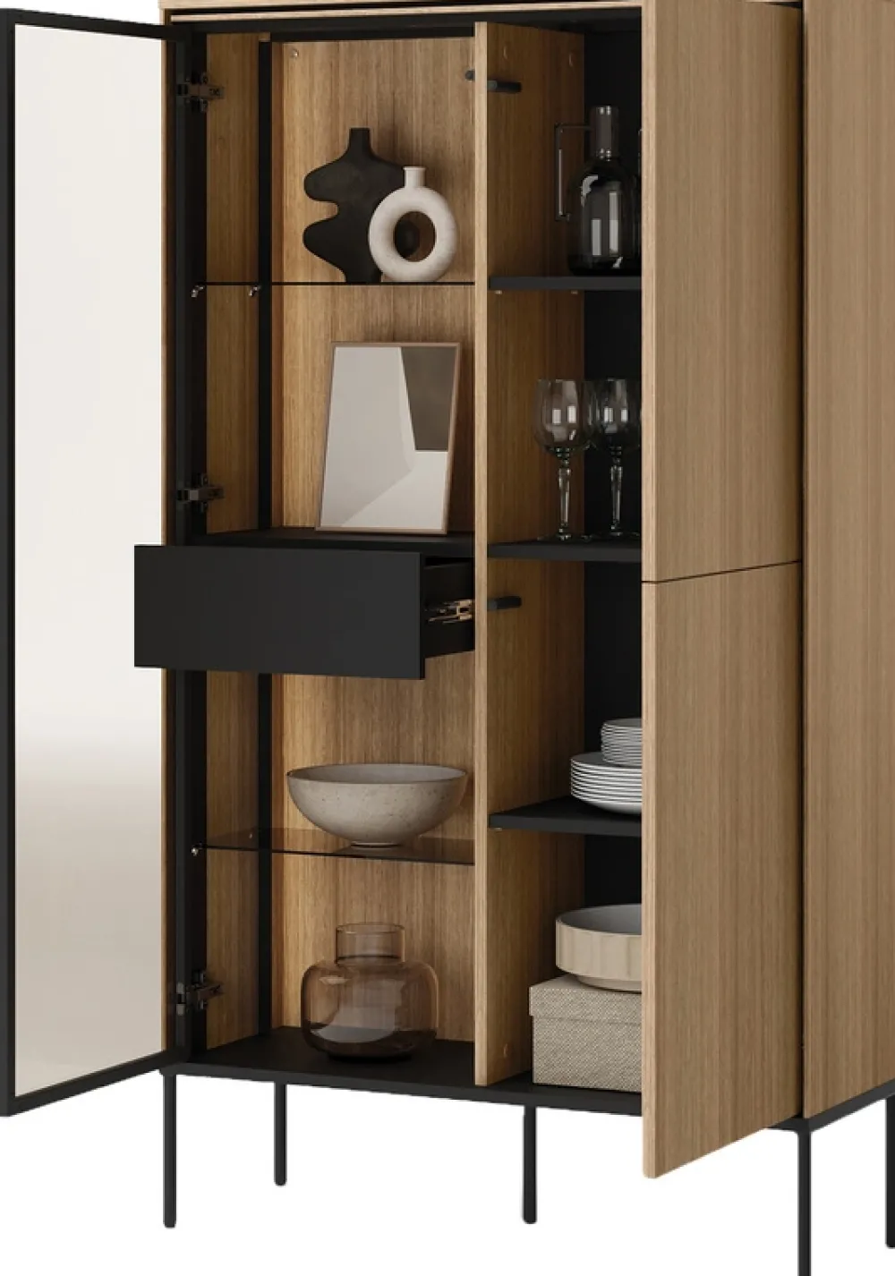 Po prawej stronie witryny znajdują się dwuskrzydłowe drzwi, za którymi ukryto cztery półki, idealne do przechowywania książek, zastawy stołowej czy innych przedmiotów codziennego użytku. Dzięki zamkniętej przestrzeni można łatwo utrzymać porządek i chronić zawartość przed kurzem.