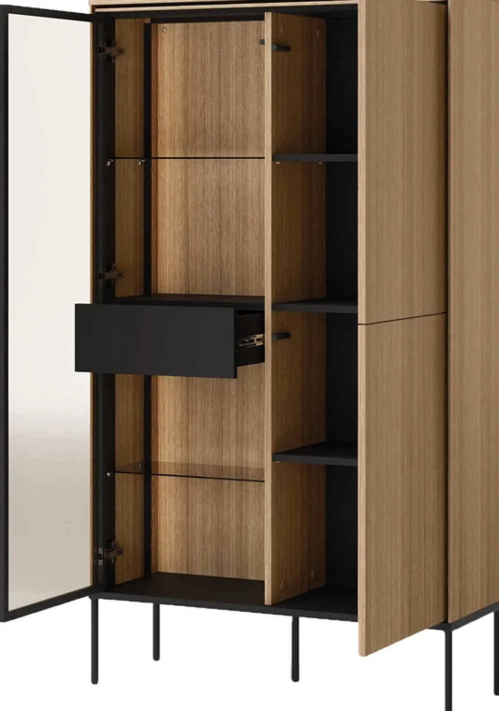 Lewą stronę witryny zdobią szklane drzwi, za którymi znajdują się dwie szklane półki, idealne do wyeksponowania dekoracji, szkła czy innych eleganckich dodatków. Pod półkami umieszczona jest praktyczna szuflada, która świetnie sprawdzi się do przechowywania drobnych przedmiotów, takich jak dokumenty czy drobne akcesoria.