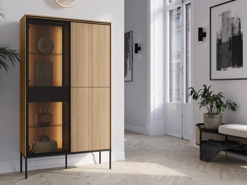 Witryna wyposażona jest w nowoczesne podświetlenie LED, które nie tylko podkreśla szklane elementy, ale także dodaje meblowi wyjątkowego uroku. Subtelne światło wprowadza do wnętrza ciepłą, przytulną atmosferę, jednocześnie eksponując zawartość witryny w wyjątkowy sposób.