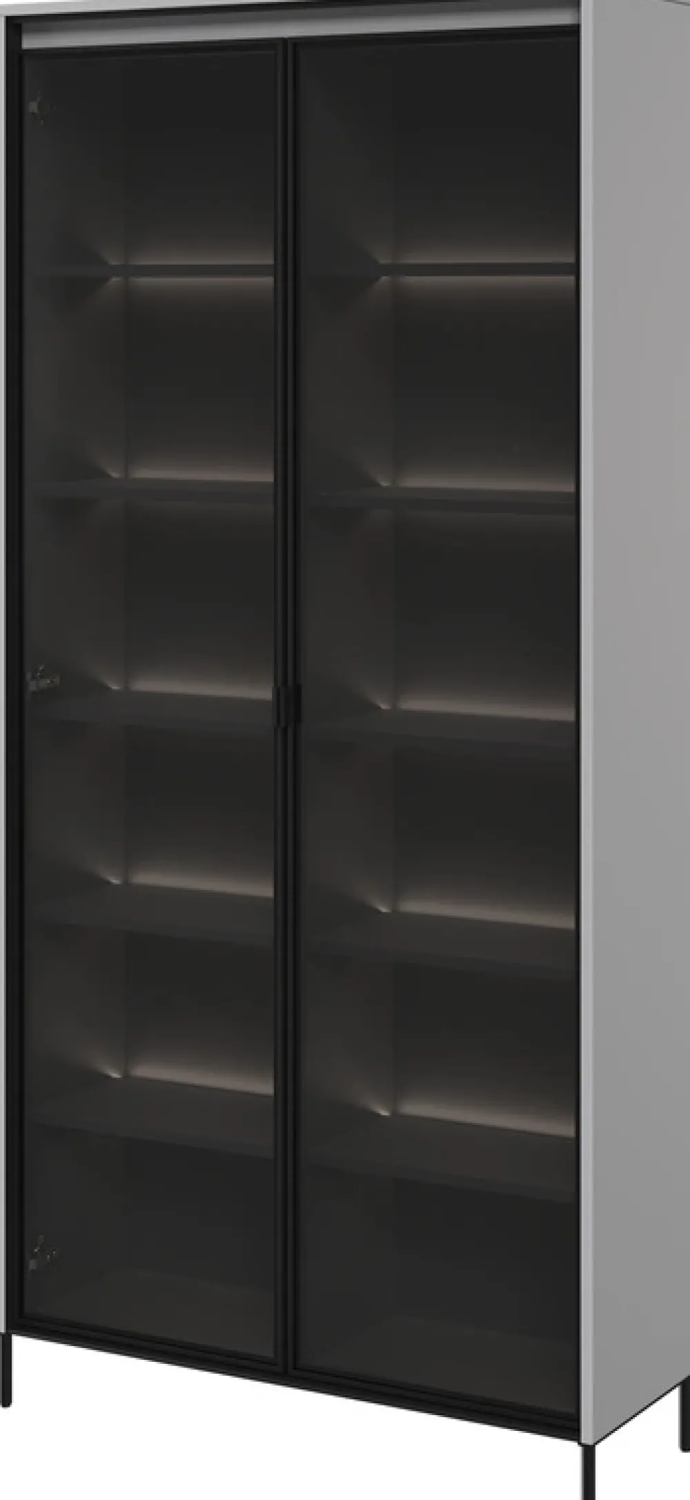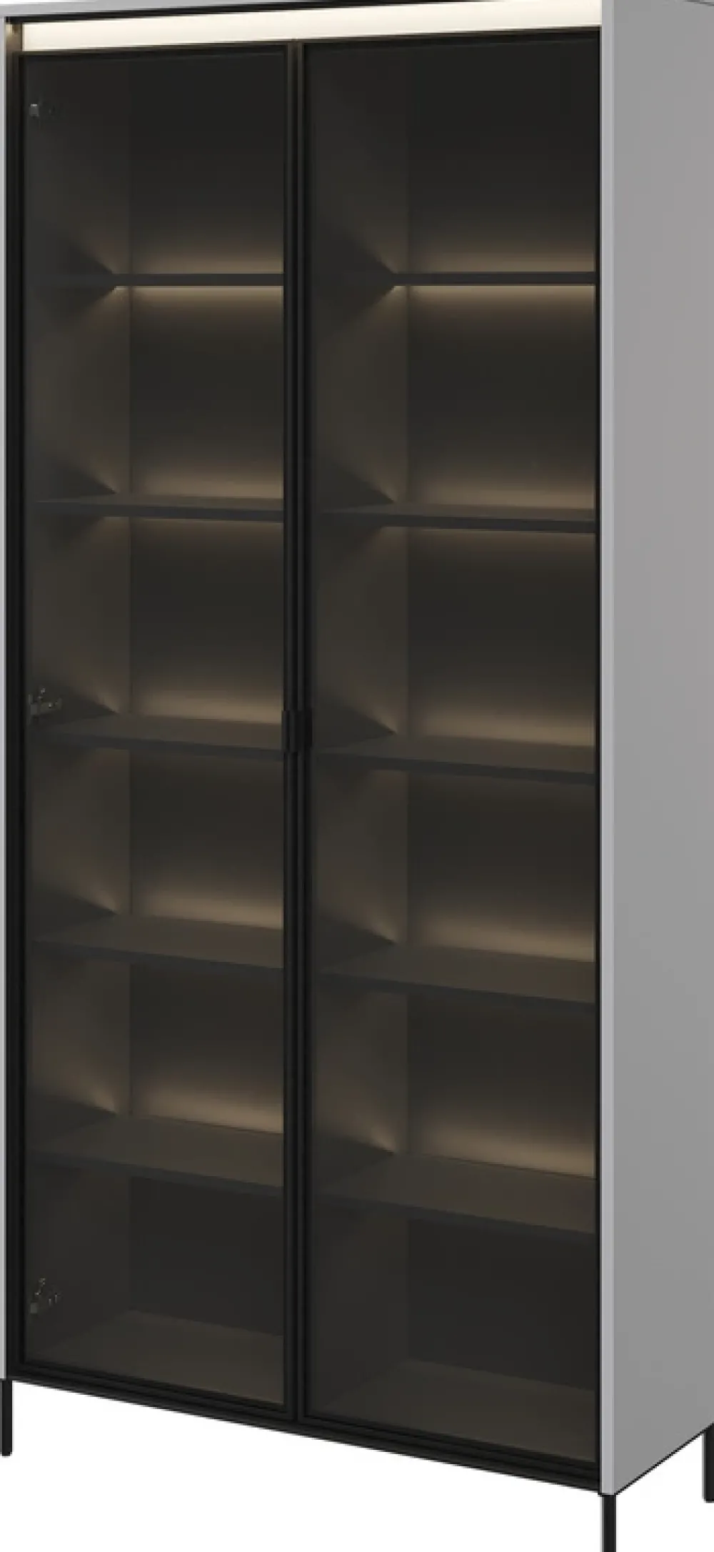 Fronty witryny wykonane są z barwionego szkła w kolorze antisol grafitowy, co nadaje im niezwykłej głębi i wyrazistości, a także pozwala na wyeksponowanie ulubionych przedmiotów, a jednocześnie dodaje meblowi elegancji i lekkości.
