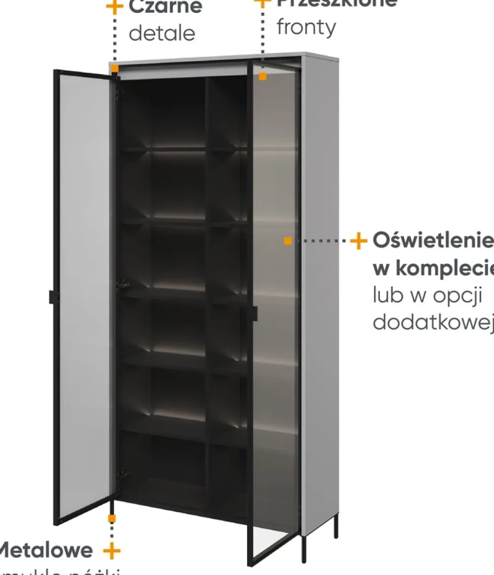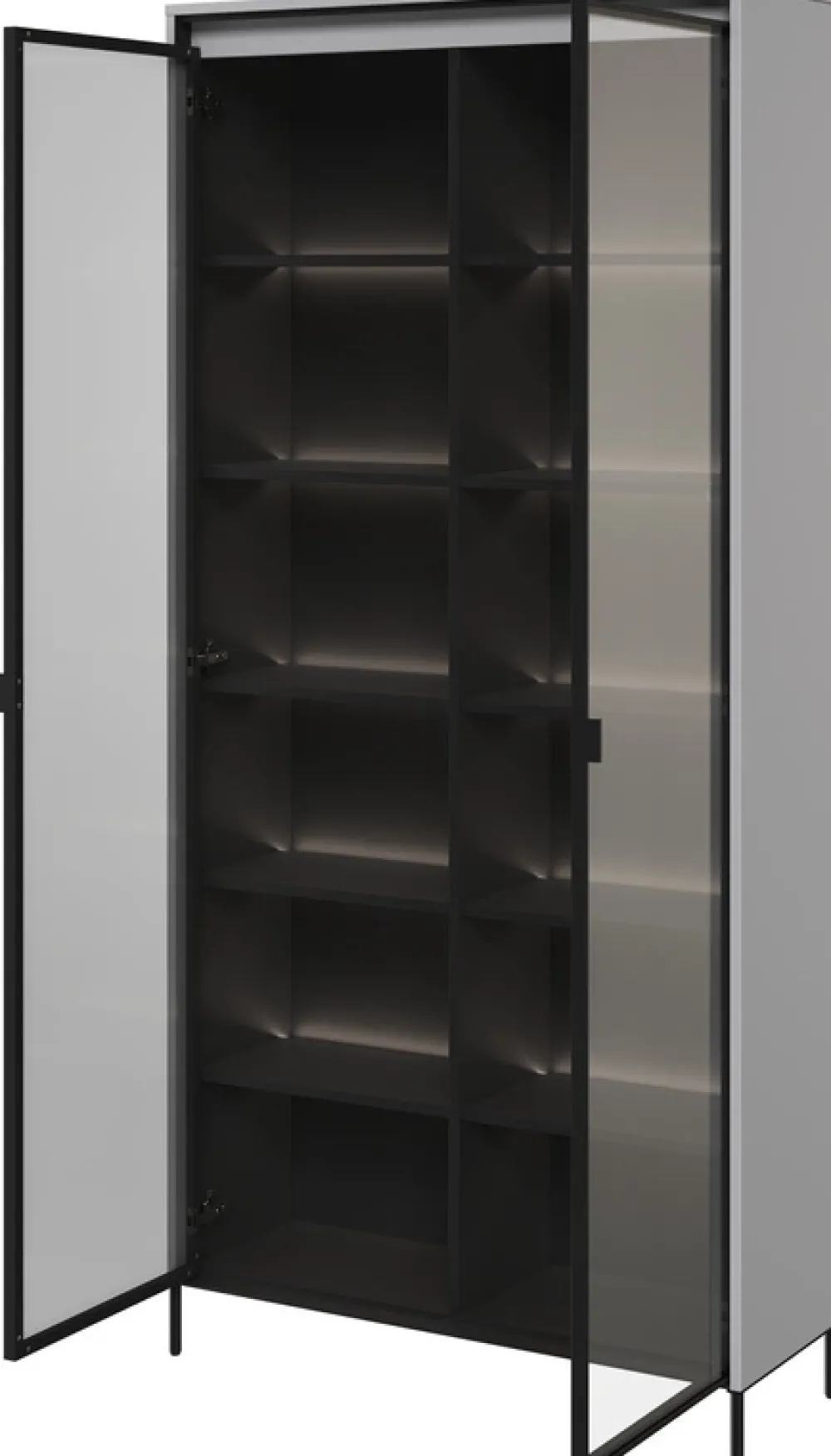 Witryna posiada aż 12 półek, które oferują przestronne miejsce na ekspozycję ulubionych przedmiotów. Witryna posiada oświetlenie LED klasy A++, które doda pomieszczeniu klimatu oraz opcjonalnie można dokupić podświetlenie półek, które podkreśli ich urok, a jednocześnie jest energooszczędne i długotrwałe. Opcjonalne oświetlenie znajdziecie państwo w sekcji polecane