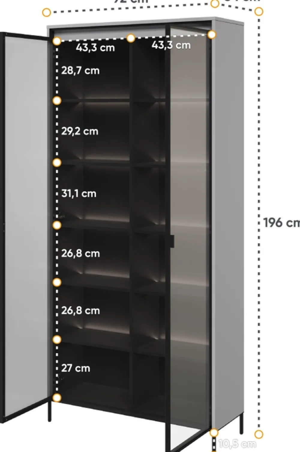 Korpus witryny jest wykonany z 16-milimetrowej płyty laminowanej o kolorze szarym. Ten nowoczesny, uniwersalny odcień dodaje meblowi subtelności, a jednocześnie podkreśla jego nowoczesny charakter. Szary kolor korpusu świetnie komponuje się z różnymi stylami wnętrza, od minimalistycznego po industrialny.