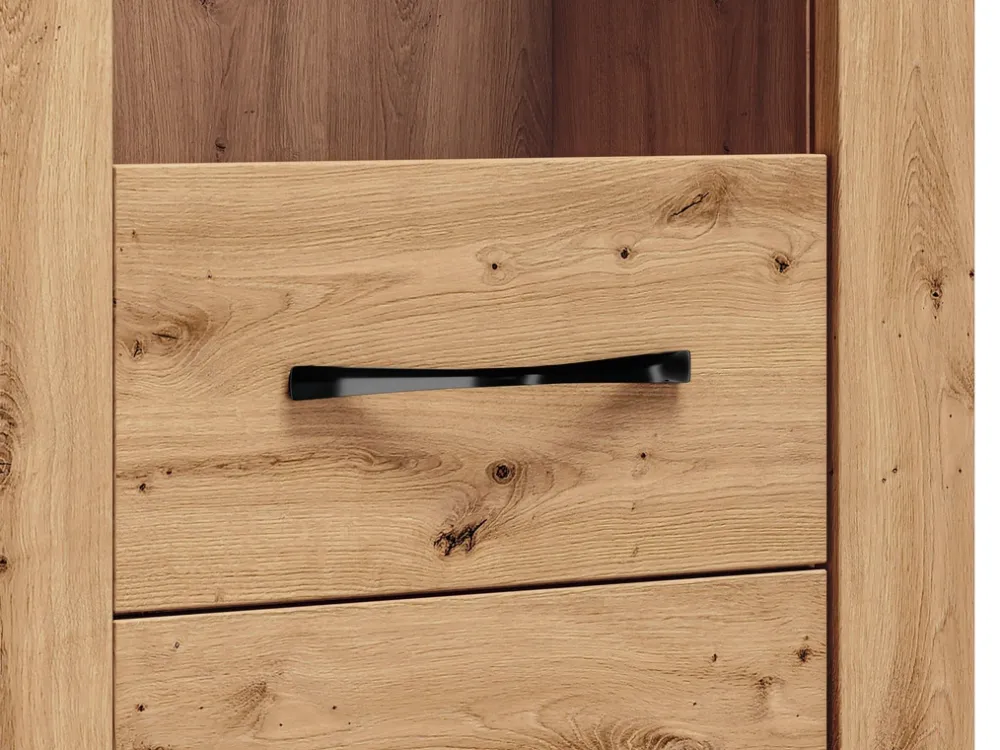 - Witryna do salonu ARTIS posiada drzwi u dołu, za którymi znajdują się dwie półki, oraz górne drzwi, za którymi znajduje się półka wykonana z płyty laminowanej oraz dwie półki szklane. Witryna posiada czarne metalowe uchwyty oraz obrzeża ABS.