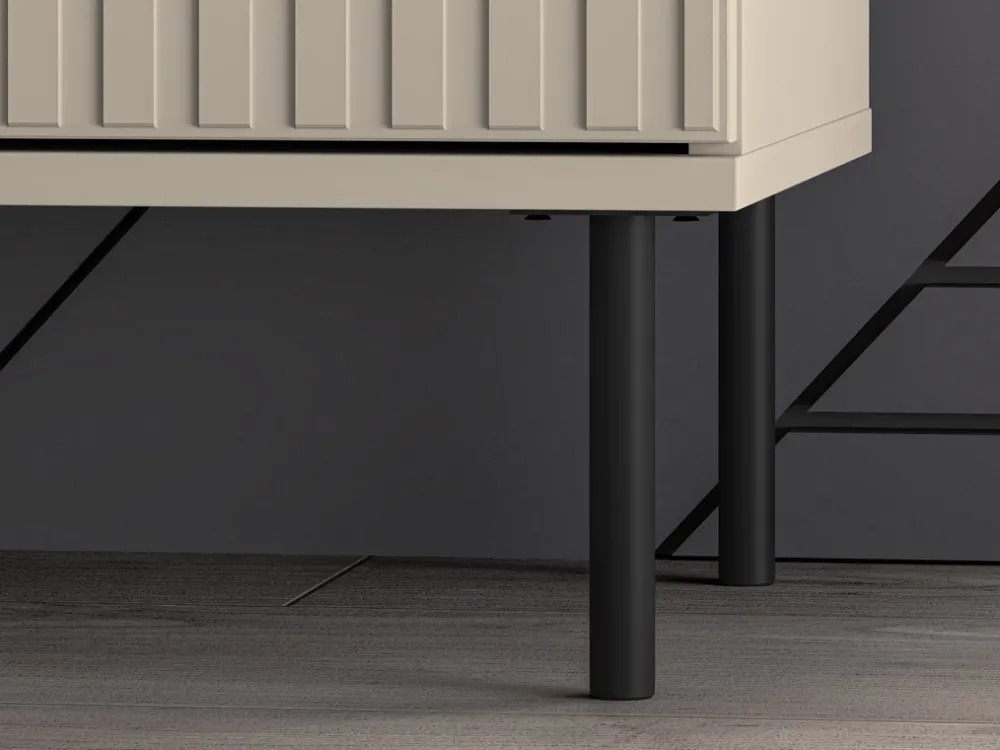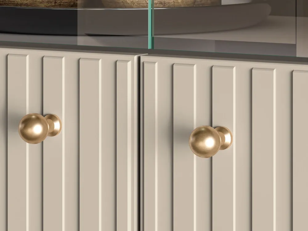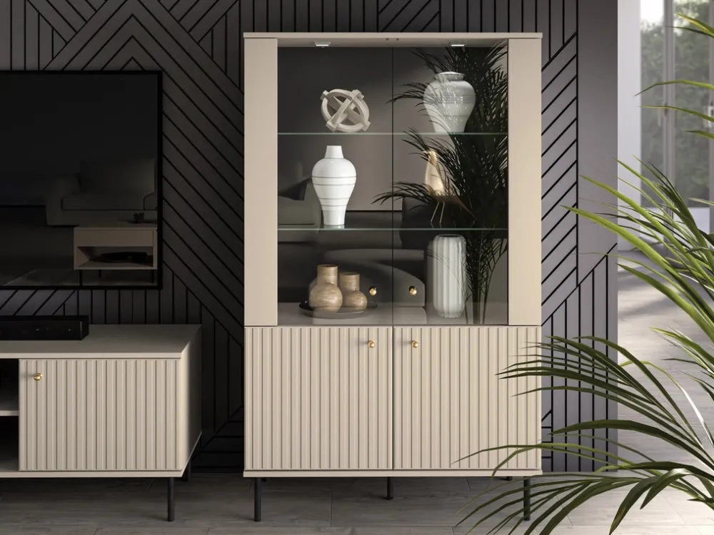 Korpus i front witryny wykonane są z wysokiej jakości płyty laminowanej, co gwarantuje trwałość i odporność na uszkodzenia. Część frontu zdobią finezyjne lamele z płyty MDF, które dodają meblowi wyrafinowanego charakteru. Całość utrzymana jest w eleganckim kolorze cashmere, który doskonale komponuje się z różnorodnymi aranżacjami wnętrz. Dodatkowym atutem są obrzeża zabezpieczone okleiną ABS, co zwiększa trwałość i estetykę mebla.