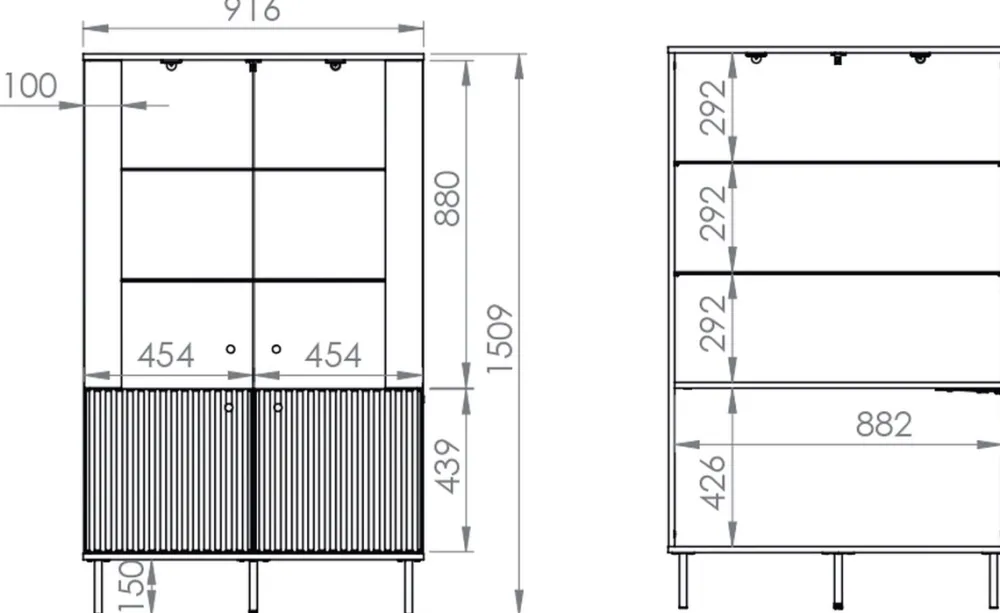 - Korpus oraz front witryny wykonano z płyty laminowanej 16 mm, natomiast część frontu z lamelami wykonano z płyty MDF. Płyta laminowana charakteryzuje się odpornością na drobne zarysowania, a płyta MDF jest materiałem o wysokiej gęstości, co również przekłada się na jej wytrzymałość.