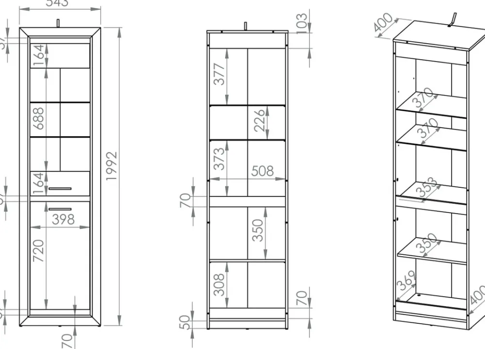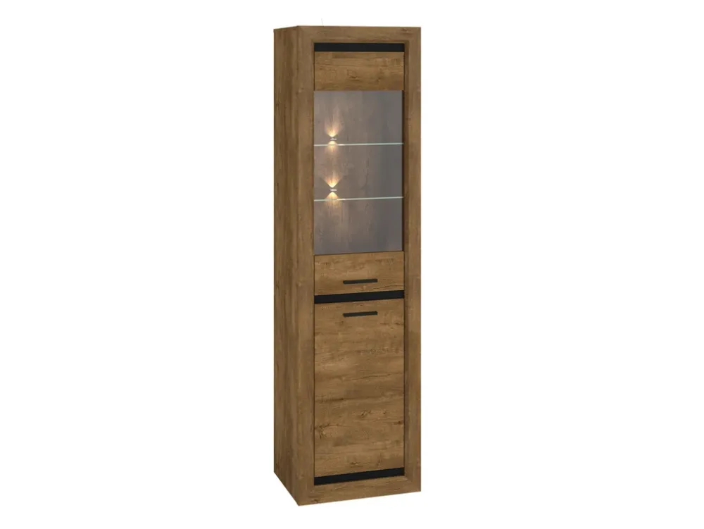 Witryna została wykończona w kolorze dąb lefkas, który wprowadza do wnętrza ciepło i naturalny urok drewna. Ten odcień doskonale komponuje się z różnymi stylami aranżacyjnymi – od nowoczesnych po klasyczne, dodając wnętrzu elegancji i przytulności.