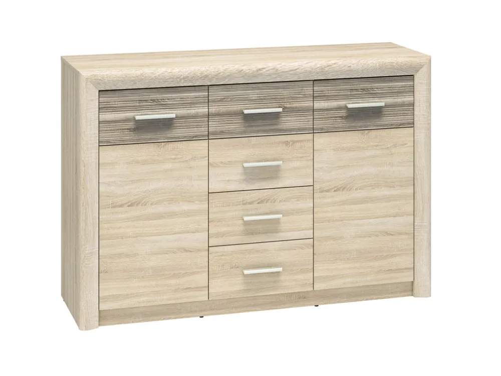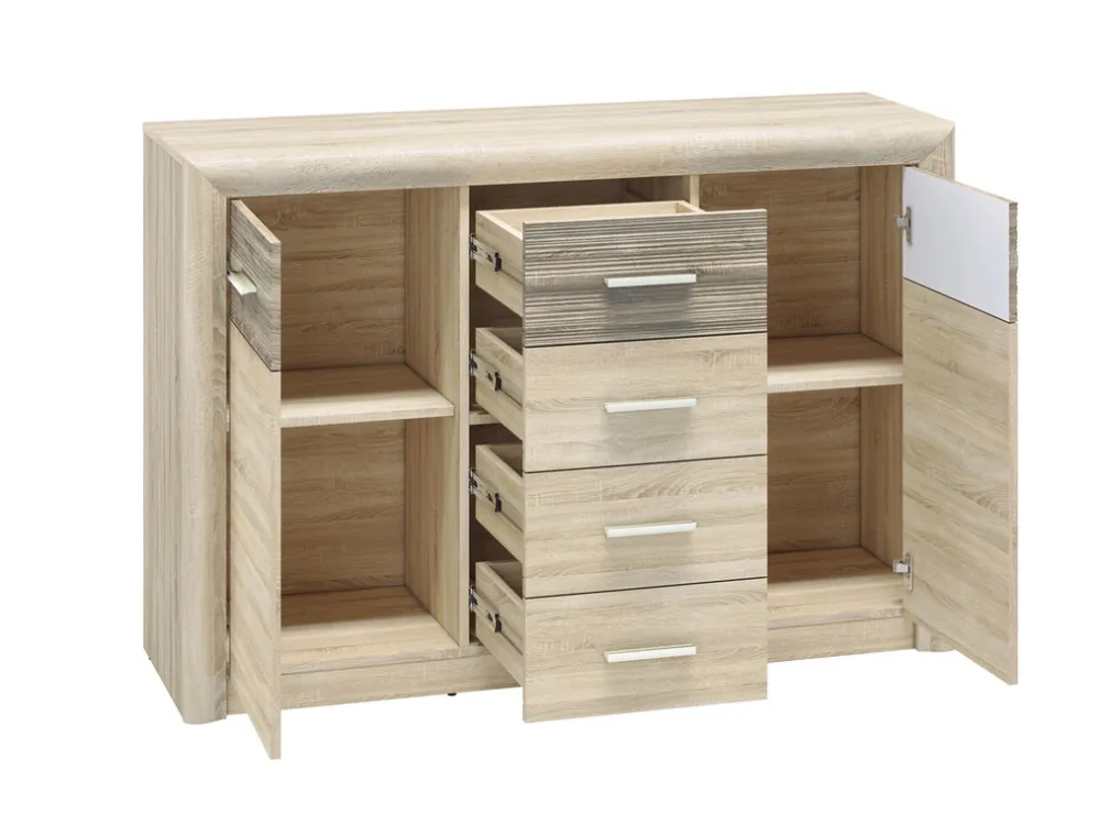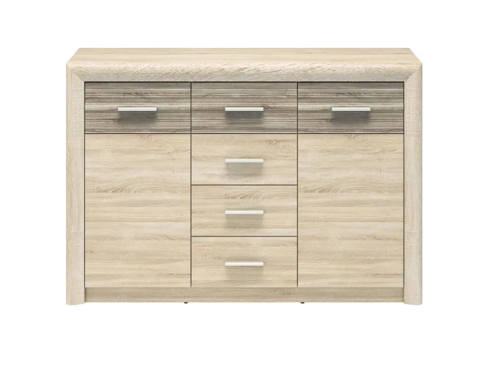 Po lewej i prawej stronie komody znajdują się drzwi, za którymi kryją się po jednej półce z każdej strony. Te pojemne przestrzenie idealnie nadają się do przechowywania większych przedmiotów, takich jak dokumenty, książki, czy zastawa stołowa. Solidne drzwi w kolorze dąb sonoma dodają komodzie elegancji, a jednocześnie chronią zawartość przed kurzem i przypadkowym uszkodzeniem.