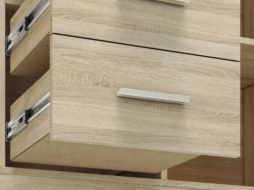 Centralną część komody zajmują cztery szuflady, które zostały osadzone na prowadnicach kulkowych. Dzięki temu rozwiązaniu każda szuflada otwiera się płynnie i cicho, zapewniając wygodny dostęp do przechowywanych w nich rzeczy. To idealne miejsce na drobne przedmioty, takie jak bielizna, akcesoria, czy dokumenty, które zawsze chcesz mieć pod ręką. Prowadnice kulkowe gwarantują trwałość i komfort użytkowania, nawet przy intensywnym użytkowaniu.