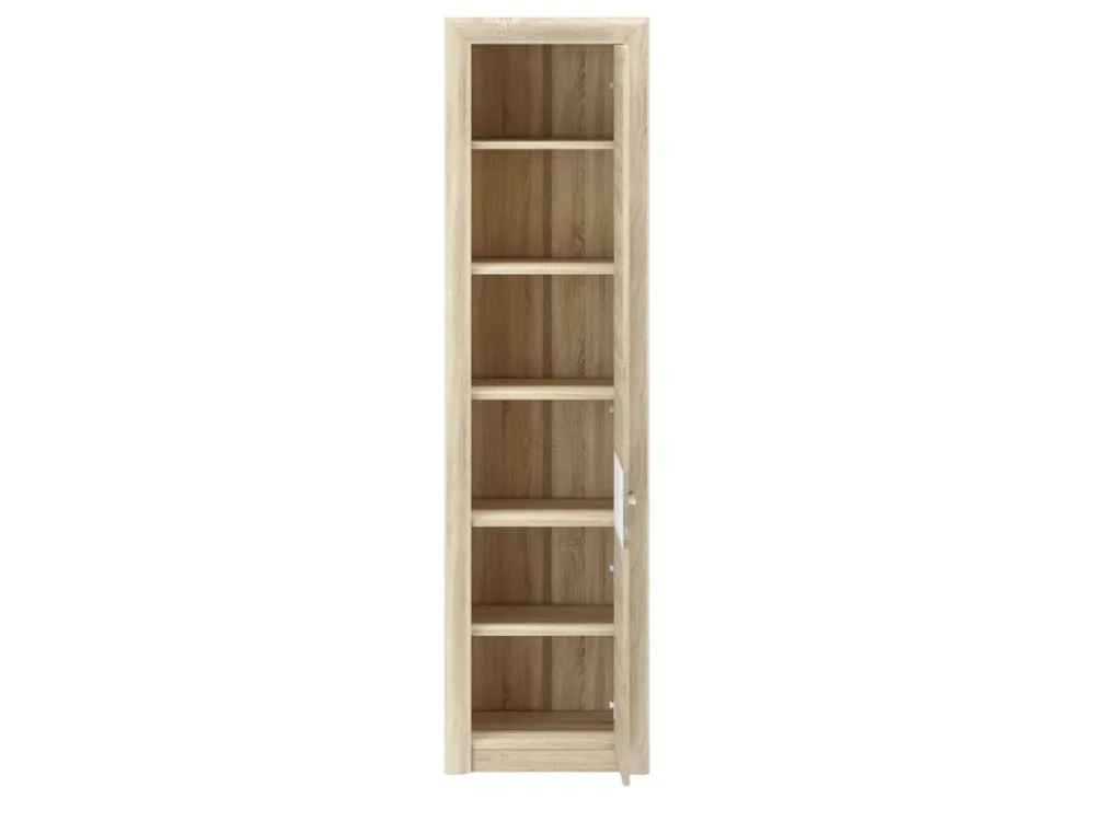 - Szafa uchylna CASTEL posiada 55 cm szerokości. Wewnątrz szafy znajduje się pięć półek na ubrania i akcesoria. Szafa posiada wstawkę wykonaną w kolorze truflowym z płyty MDF. Korpus i front szafy wykonano z płyty laminowanej 16 mm w kolorze dąb sonoma.