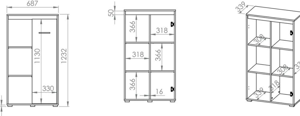 - Wysoka komoda do pokoju dziennego AVO posiada 69 cm szerokości, które obejmują trzy otwarte półki oraz trzy półki za drzwiami. Uchwyty oraz nóżki wykonano z tworzywa w srebrnym kolorze. Regał posiada wstawkę, którą dołączamy w trzech kolorach.