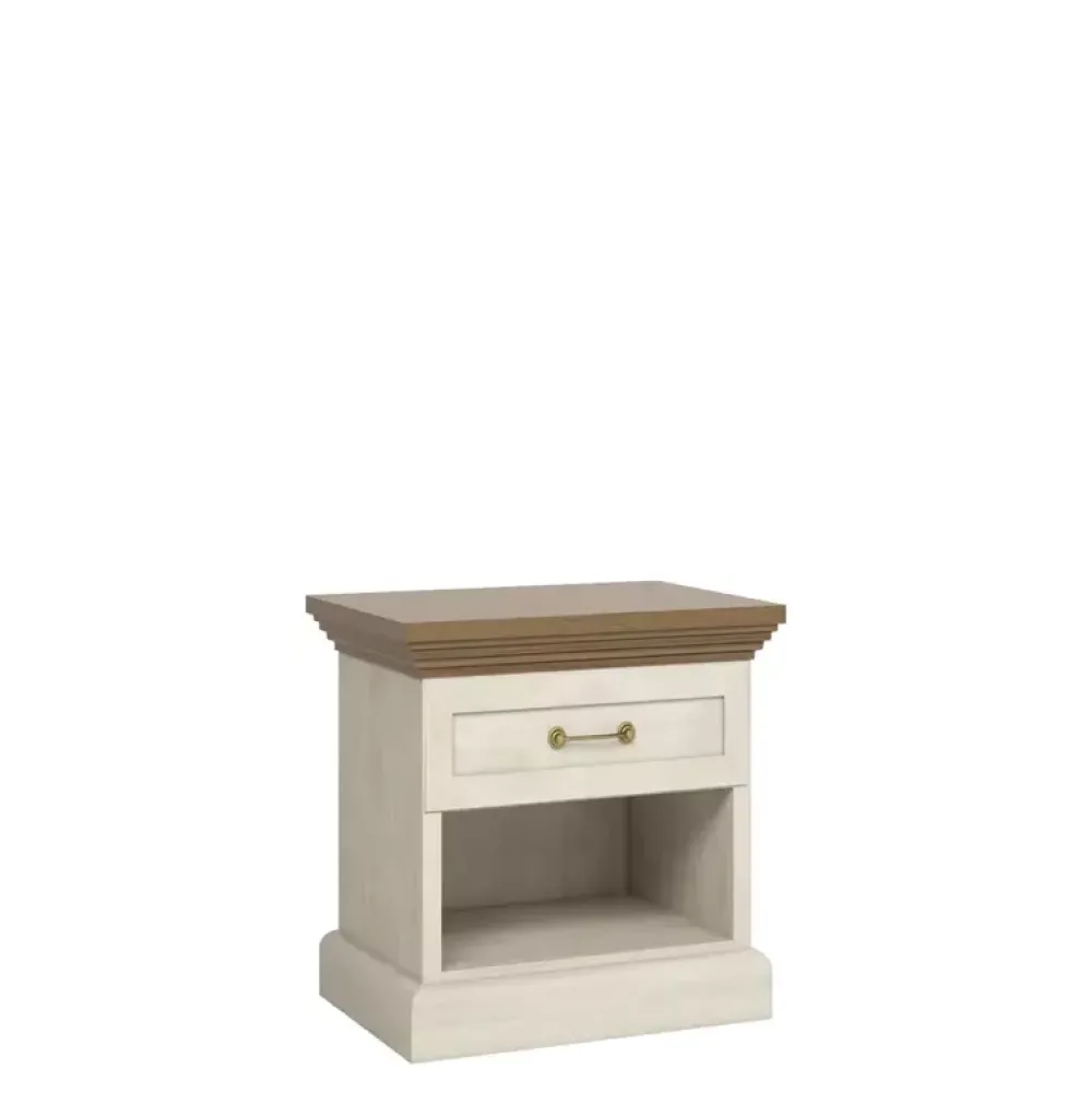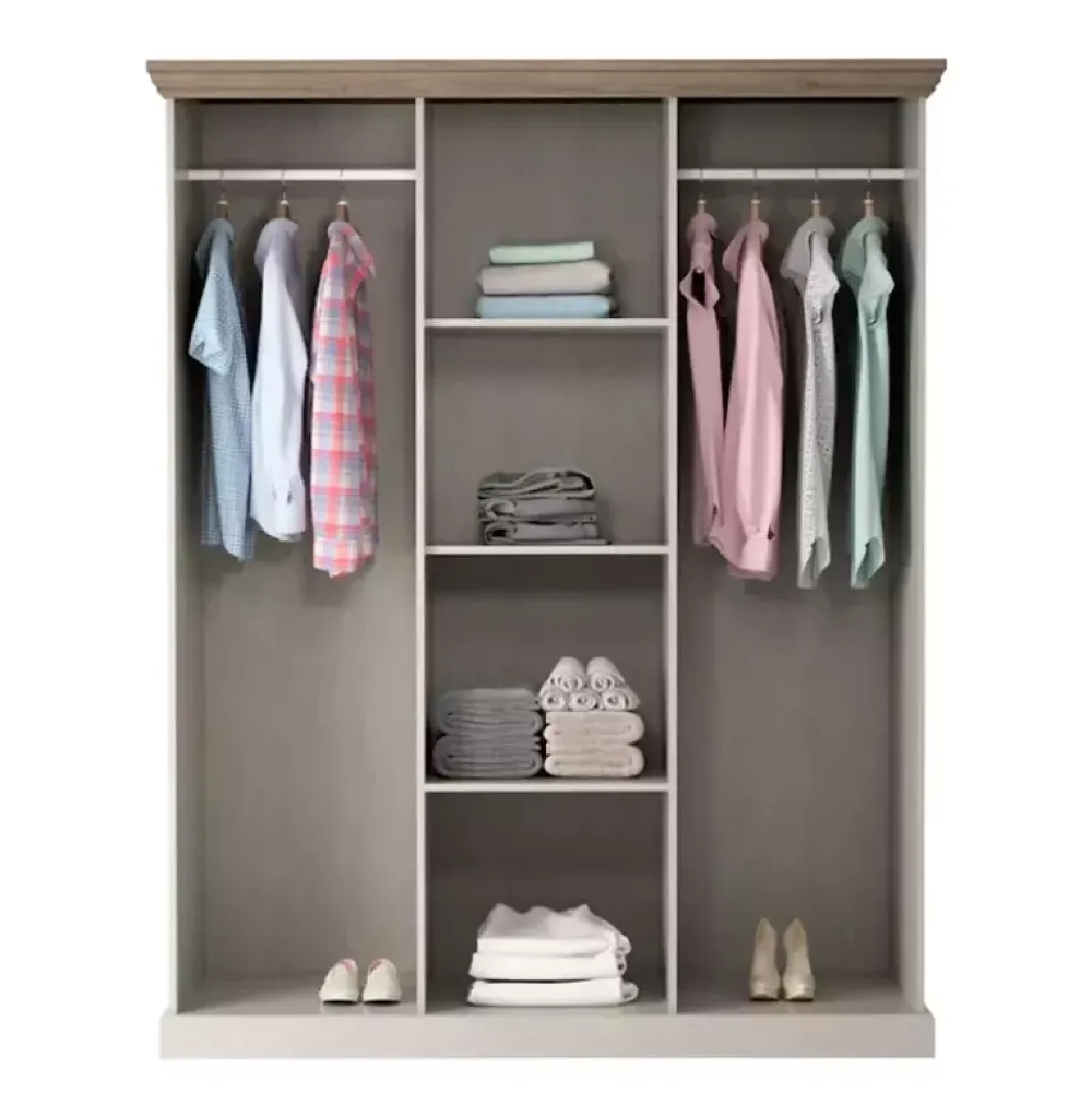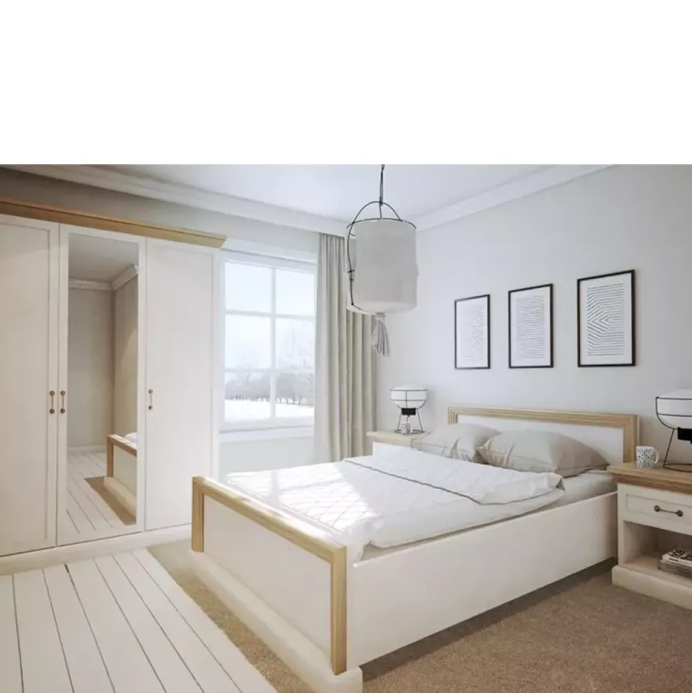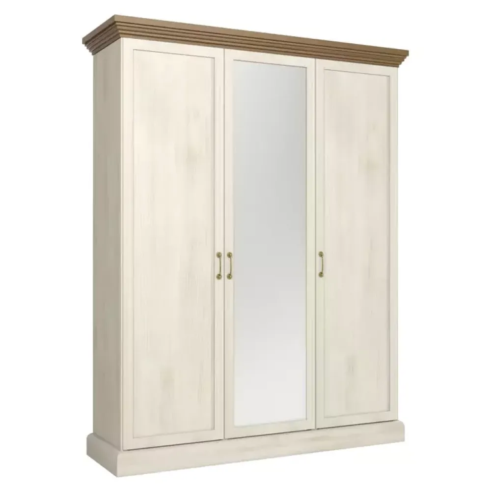 Zestaw mebli ROZANO jest propozyją która pozwala na kompleksowe zagospodarowanie sypialni w wyjątkowym oraz ponadczasowym stylu prowansalskim. W zestawie swoje miejsce znalazła pojemna szafa trzydrzwiowa z lustrem, w której znajduje się drążek na wieszaki po lewej i prawej stronie oraz trzy obszerne półki za centralnymi drzwiami szafy. Natomiast łóżko posiada zagłówek oraz drewniany stelaż z miejscem na materac o powierzchni 160×200 cm. Uzupełnieniem łóżka pozostały dwie szafki, na których można umieścić lampki nocne oraz odłożyć telefon do ładowania wieczorami.